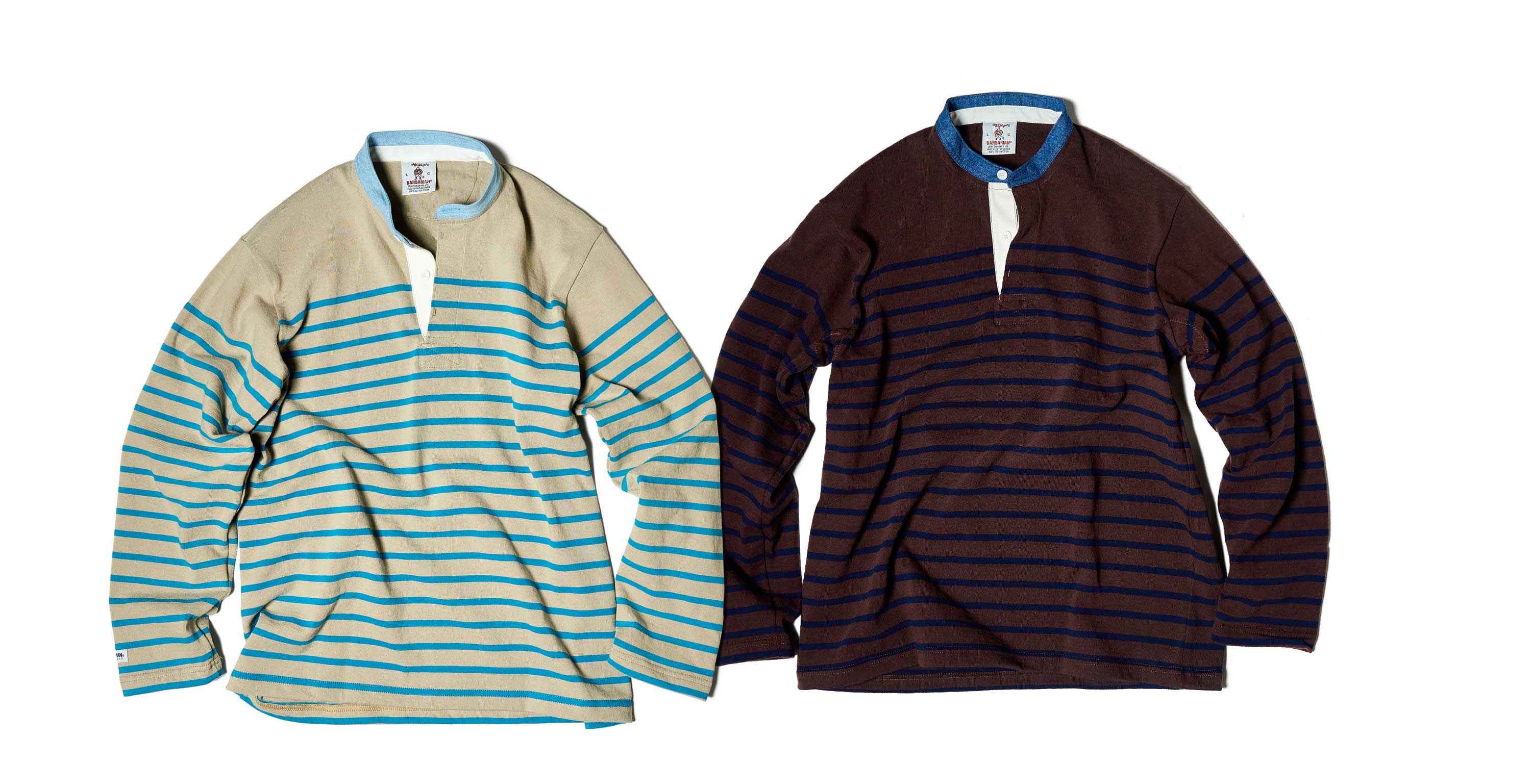 前回に引き続いて、バーバリアンの新作ラグビージャージのご紹介です。今回は襟元にご注目ください!いつものツイル生地やボディと同じニット生地ではなく、待望のデニム地を使った襟が登場しました。過去には(20数年前)ほんのわずかな期間にだけ限定的にデニム襟のバーバリアンが生産されていたことがありましたが、その当時よりさらにブラッシュアップされています。デニム襟は、ワンウォッシュほどの濃いインディゴブルーと色落ちが進んだようなライトインディゴの2種類があり、どちらも雰囲気は抜群。ラギッドなデニム生地とベースのヘビーウエイトコットンとのハーモニーによって、ラグビージャージにより濃厚な存在感が足されています。また、それぞれの生地の経年変化も期待できるので、着込んで洗い込んだ後の風合いの変化も楽しみたいところ。今回のデリバリーは、バーバリアンファンにとって垂涎の品揃えとなるはずです。是非ご覧ください。