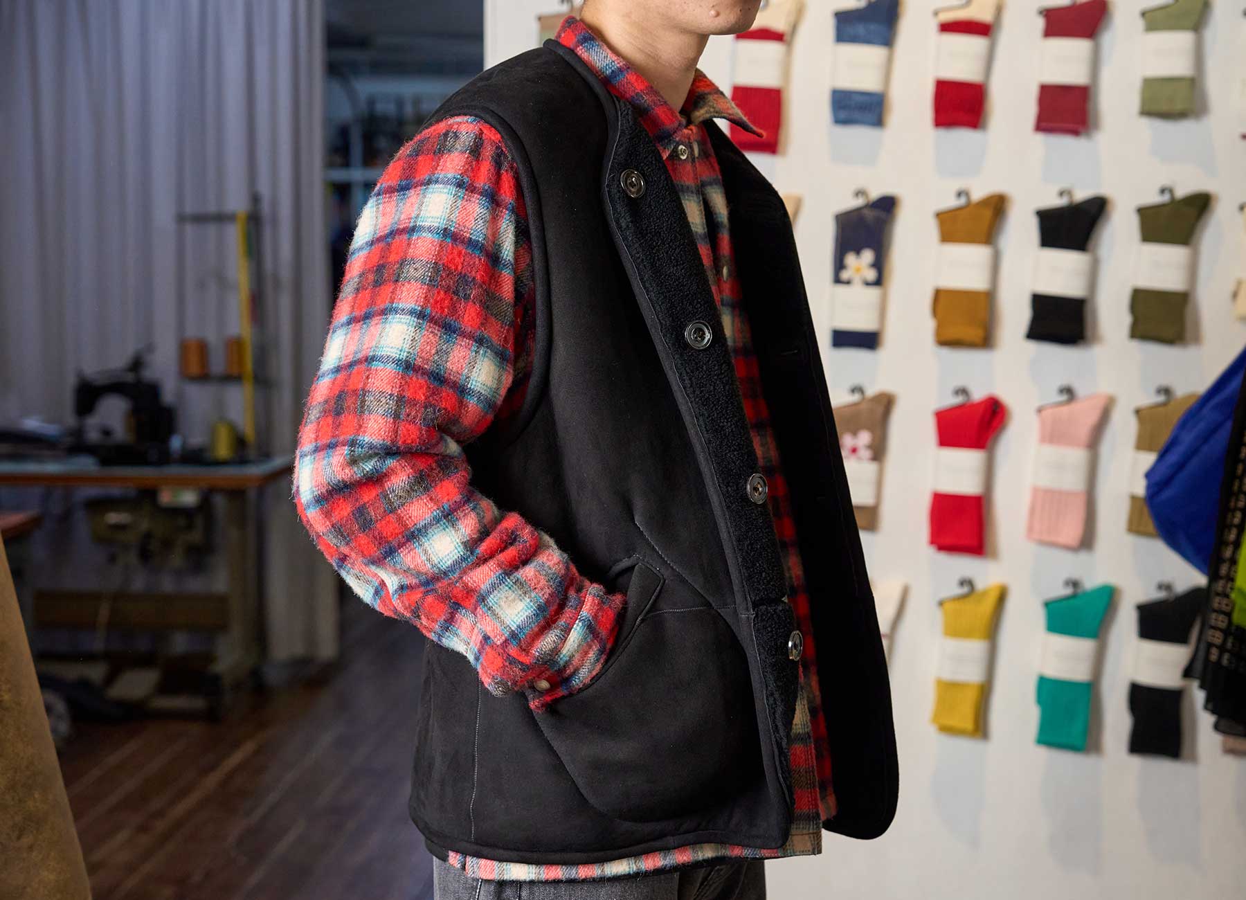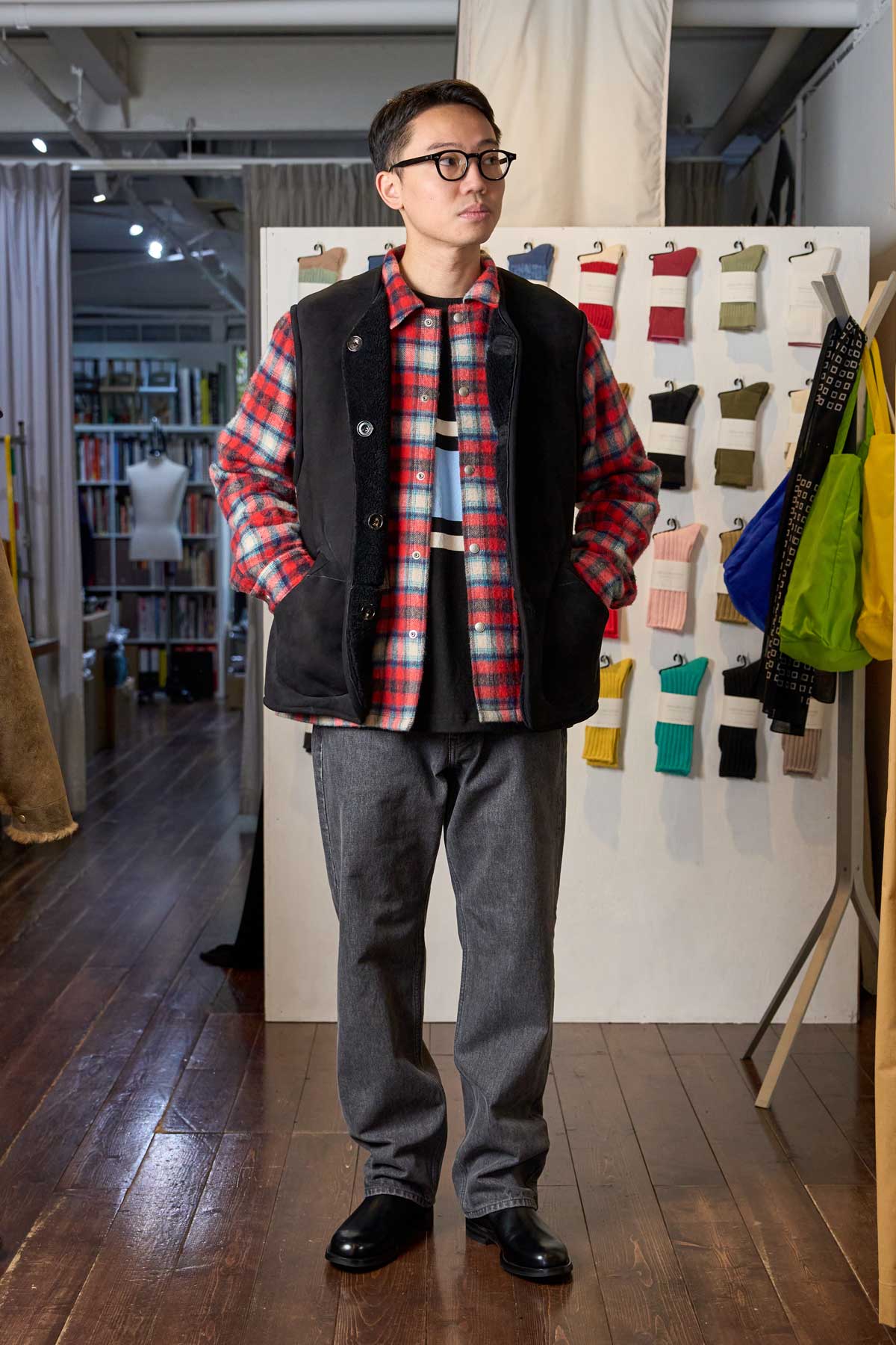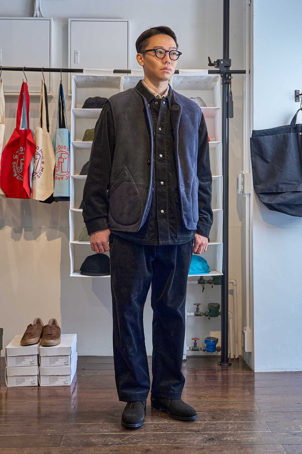 まずは、ムートンベストを使ってみました。リバーシブルということでしたが、スエード面を表に使って、アウターベストだということでしたので、FUJITOが今季提案している太畝コーデュロイのセットアップを合わせてみました。ベストの下に着ている「クルーザージャケット」はワークブランドがオイルドコットンで作っていたようなモデルからサンプリングしています。パンツは同素材を用いた、ややゆったりとしたフィットをもつ「ワイドスラックス」で、8ウェールのコーデュロイが秋冬らしさを出しています。あまり野暮ったくならないように都会的な色合わせを意識しました。上下を同じブラックでまとめて、ベストはネイビーを選ぶことでブラックとのグラデーションが感じられるようにしました。マットなムートンと起毛したコーデユロイによる素材感のコントラストも楽しめるので、ダークトーンのコーディネートですがこのコントラストがアクセントになるのではないでしょうか。靴は起毛感を揃えて、ブラックのチャッカーブーツを合わせました。インナーには淡いピンクチェックのコットンネルのシャツで少しだけ色を添えています。このムートンベストはアームホールが広くとってあるので、このようなアウターの上からでもレイヤリングがしやすいし、着丈が絶妙で、ジャケットと重ねた時の着丈のバランスも良いですね。