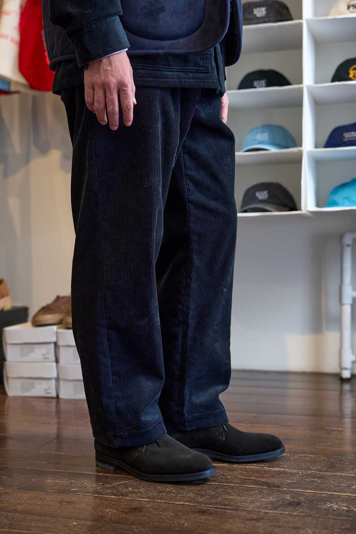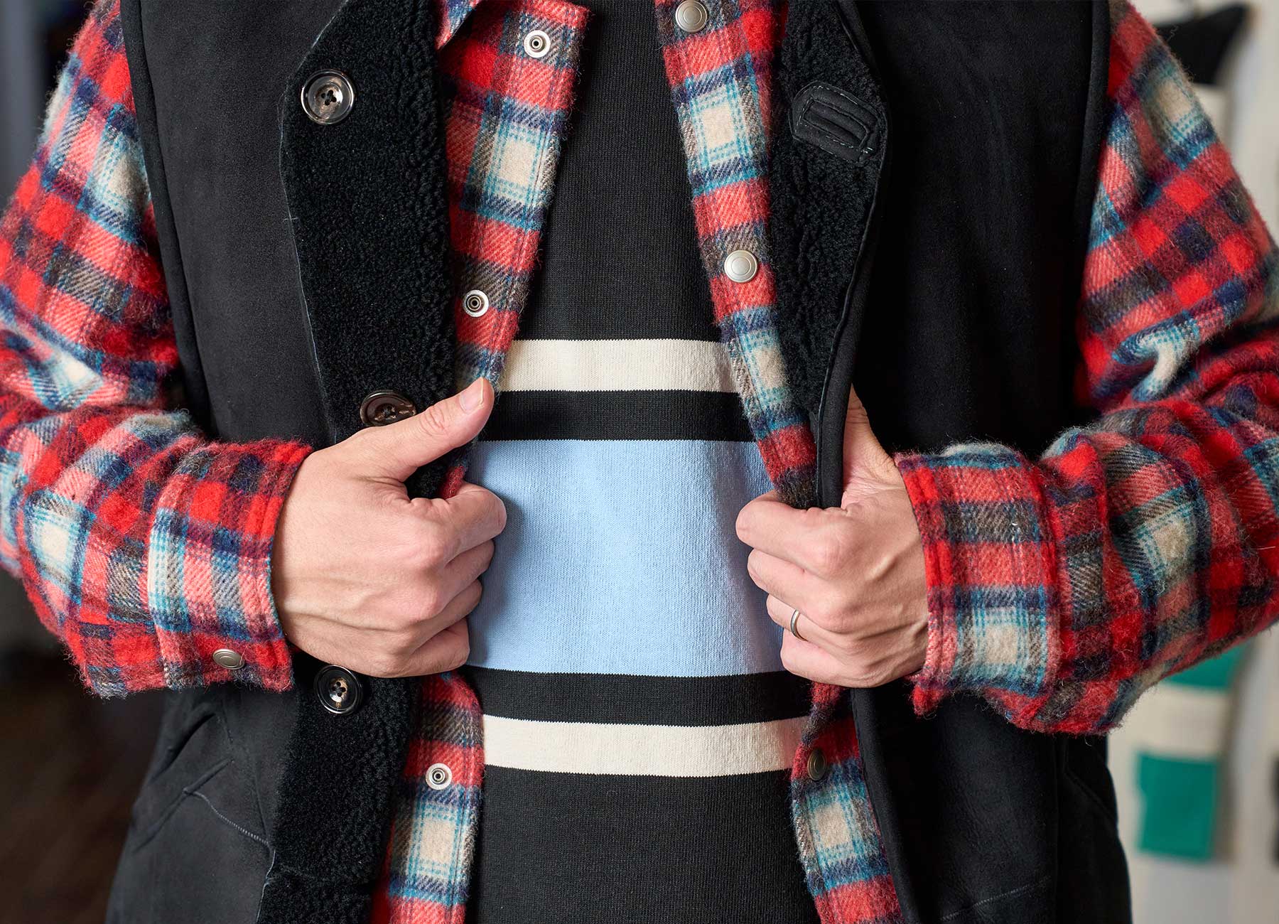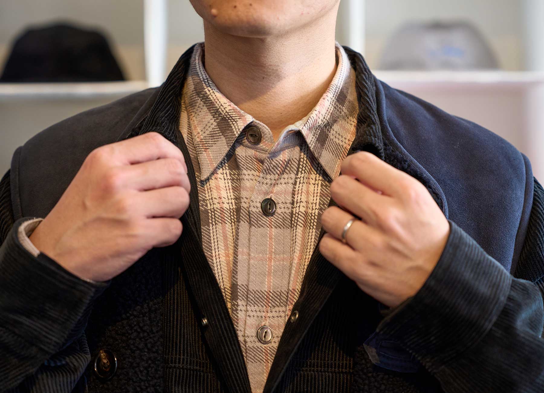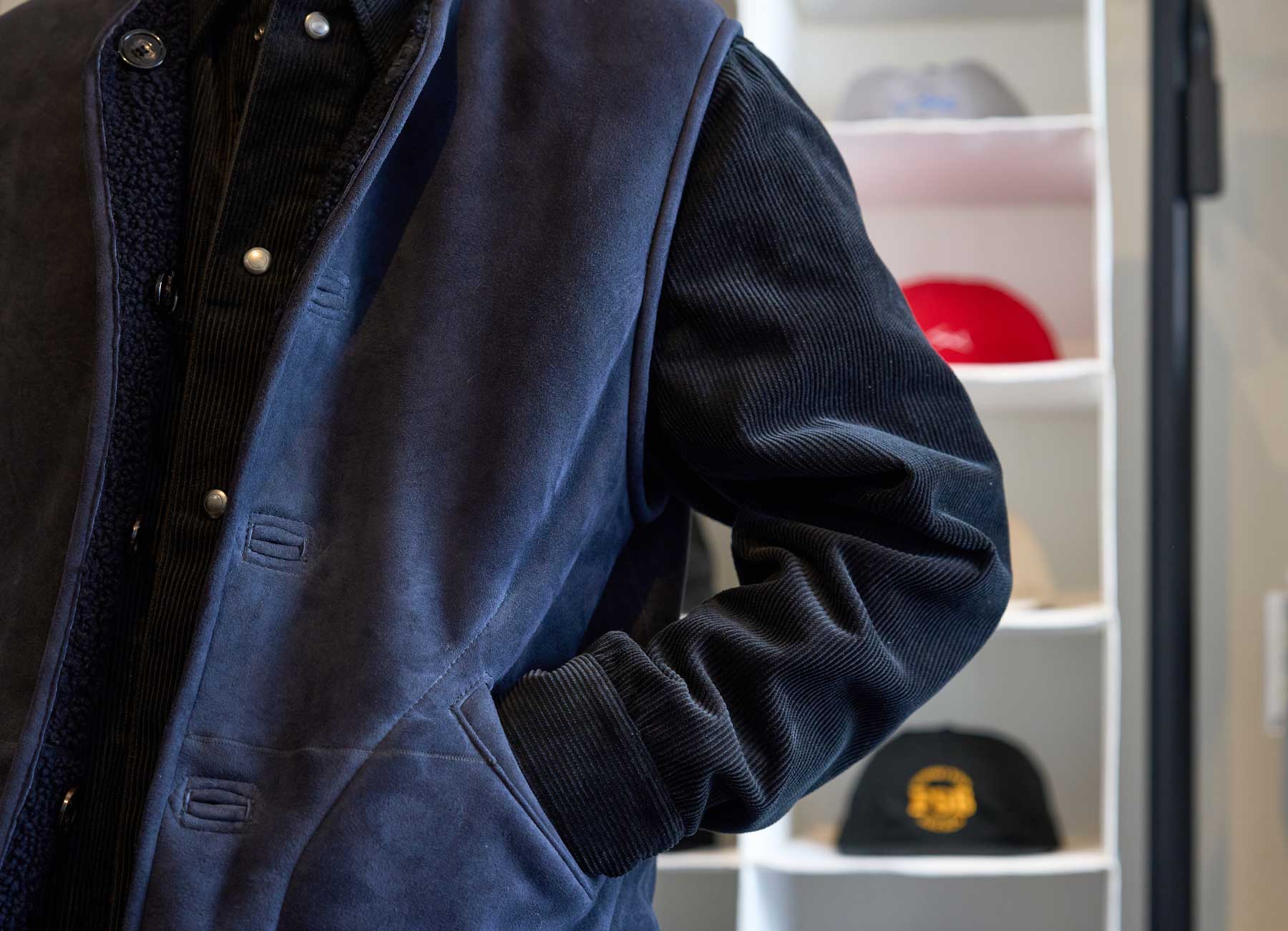 まずは、ムートンベストを使ってみました。リバーシブルということでしたが、スエード面を表に使って、アウターベストだということでしたので、FUJITOが今季提案している太畝コーデュロイのセットアップを合わせてみました。ベストの下に着ている「クルーザージャケット」はワークブランドがオイルドコットンで作っていたようなモデルからサンプリングしています。パンツは同素材を用いた、ややゆったりとしたフィットをもつ「ワイドスラックス」で、8ウェールのコーデュロイが秋冬らしさを出しています。あまり野暮ったくならないように都会的な色合わせを意識しました。上下を同じブラックでまとめて、ベストはネイビーを選ぶことでブラックとのグラデーションが感じられるようにしました。マットなムートンと起毛したコーデユロイによる素材感のコントラストも楽しめるので、ダークトーンのコーディネートですがこのコントラストがアクセントになるのではないでしょうか。靴は起毛感を揃えて、ブラックのチャッカーブーツを合わせました。インナーには淡いピンクチェックのコットンネルのシャツで少しだけ色を添えています。このムートンベストはアームホールが広くとってあるので、このようなアウターの上からでもレイヤリングがしやすいし、着丈が絶妙で、ジャケットと重ねた時の着丈のバランスも良いですね。