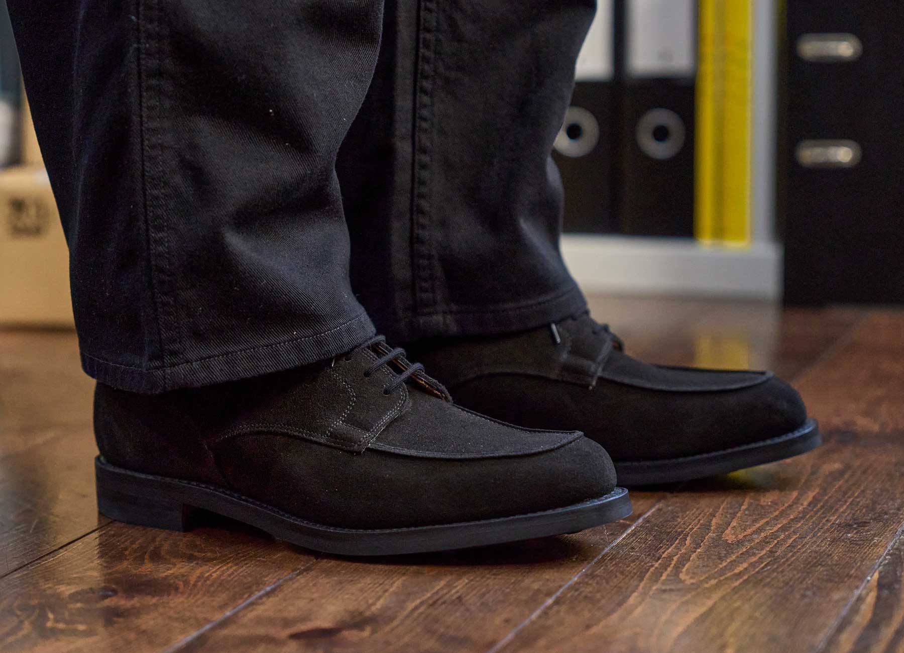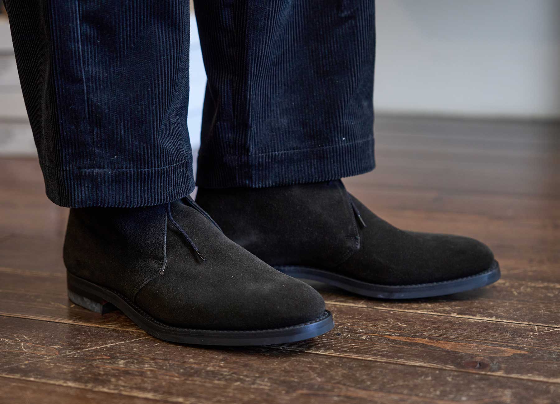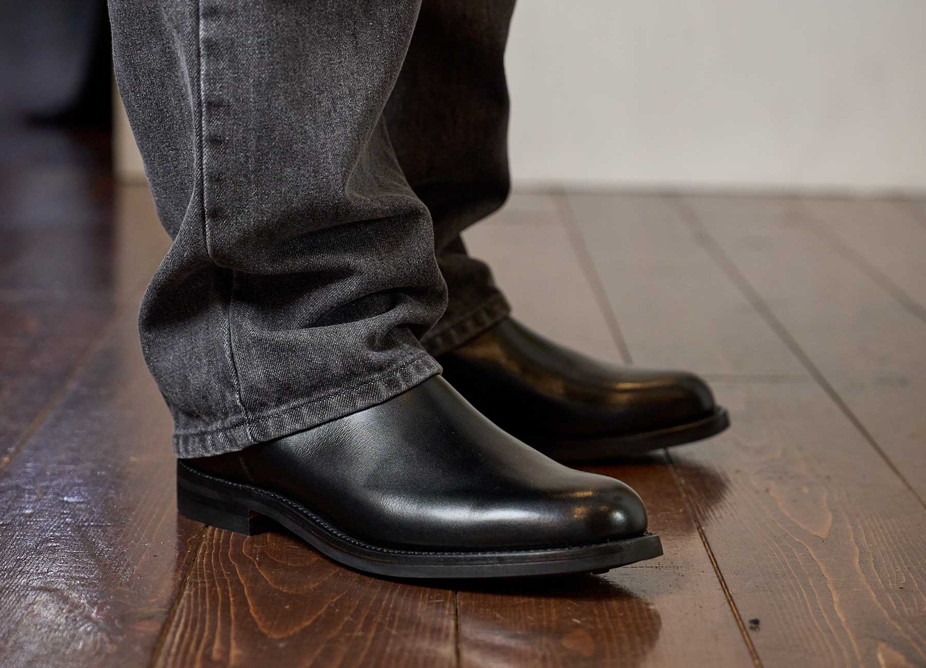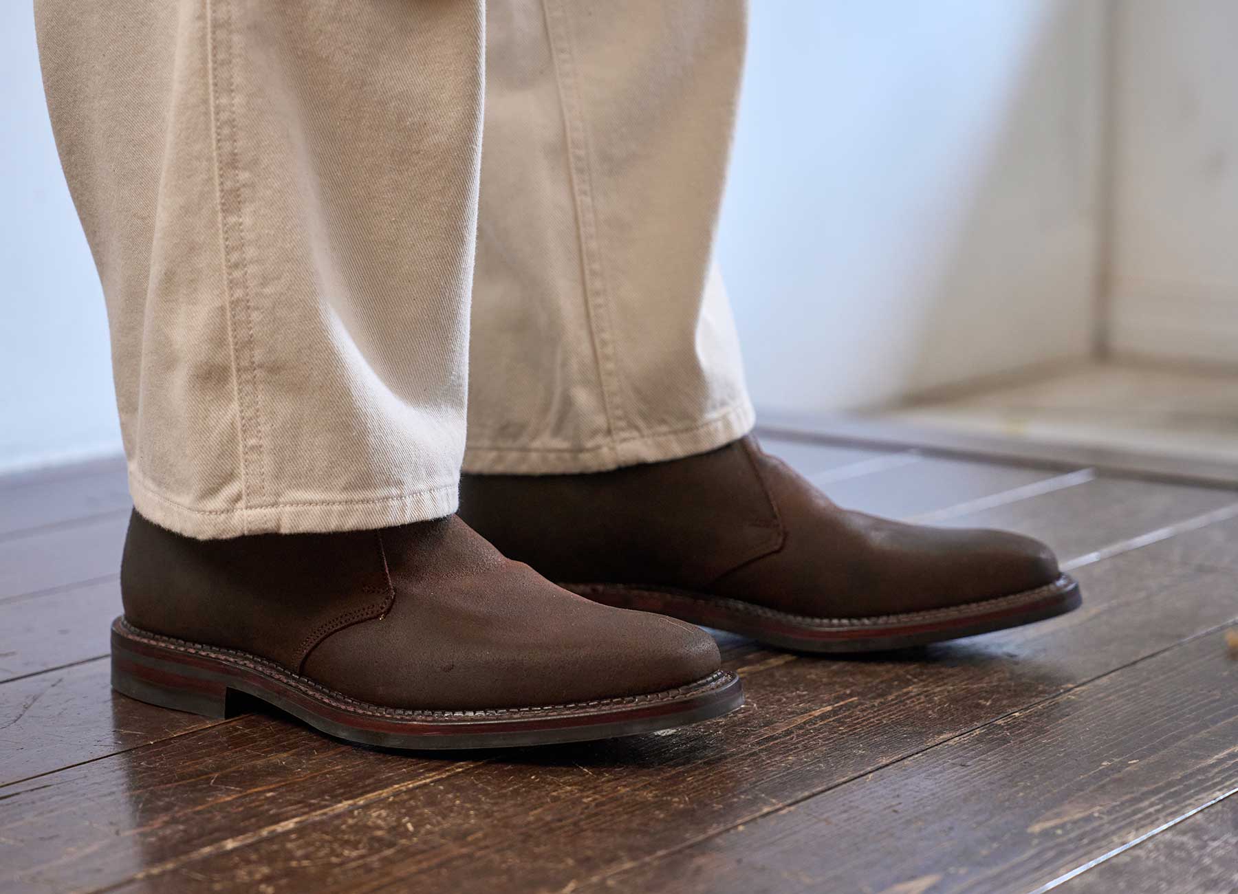 鮮やかな赤いチェックのCPOジャケットをメインにブラックムートンのベストを合わせました。フェードしたブラックデニムのパンツはブーツカットタイプで、膝から裾までがほぼ真っ直ぐに落ちたシルエットになっています。足元はこのシルエットと相性の良さそうなクロケット&ジョーンズのサイドゴアブーツです。モノトーンの中に明るめのチェックが映える洗練された印象ですね。暑過ぎず、車に乗る方にもちょうど良いコーディネートを意識していて、着丈の具合も車に乗った時に邪魔にならない絶妙な丈感にまとめていています。ドアtoドアで過ごされる方には最適ではないでしょうか。CPOのシャギーした起毛感とムートンの素材感がリンクしているのでまとまってみえると思います。そして、ジャケットのインナーには入荷したばかりの『Directors』別注のバーバリアンです。ヘビーウエイトコットンを使ったクルーネックシャツをカラー別注させてもらいました。デザインの肝であるセンターストライプにはFUJITOのブランドカラーであるFUJITO BLUEに近いくすんだ淡いブルーを選んでいます。