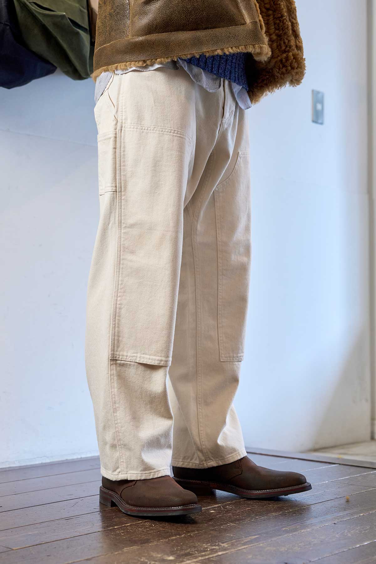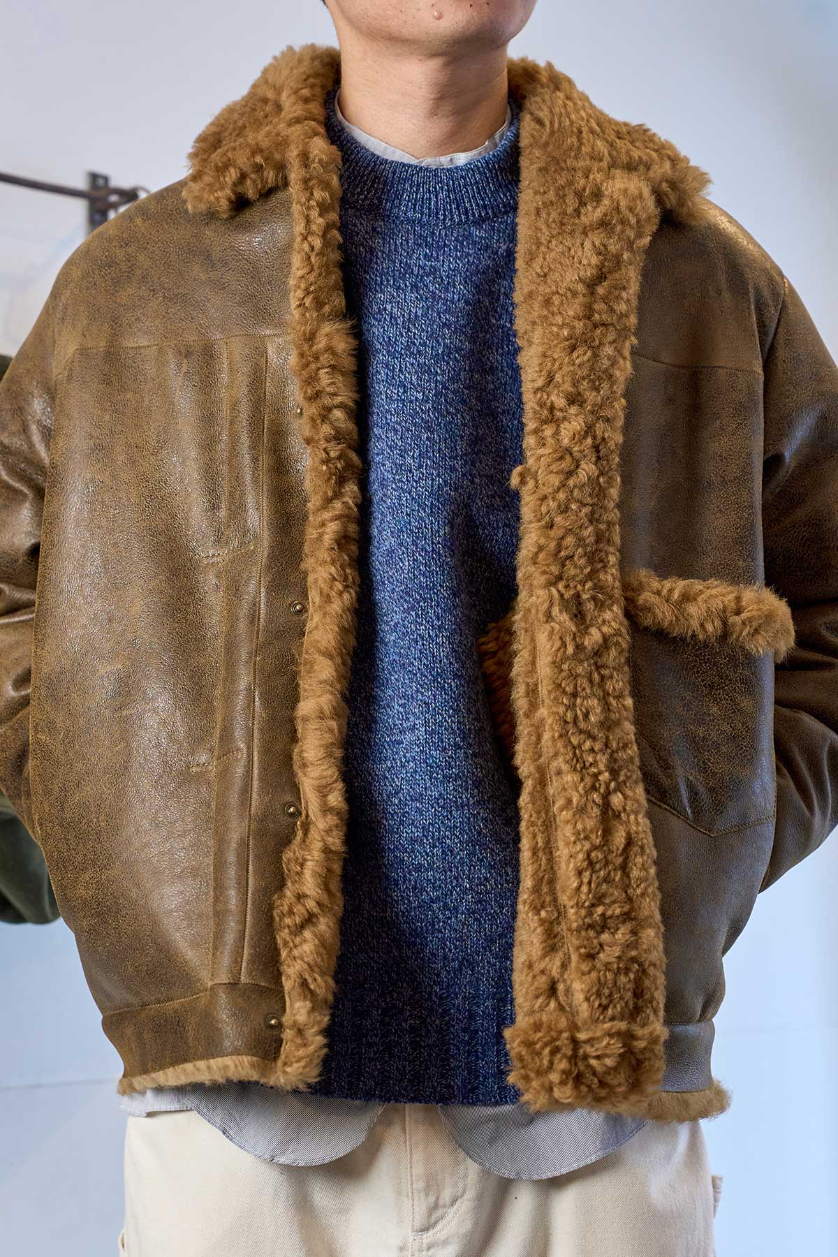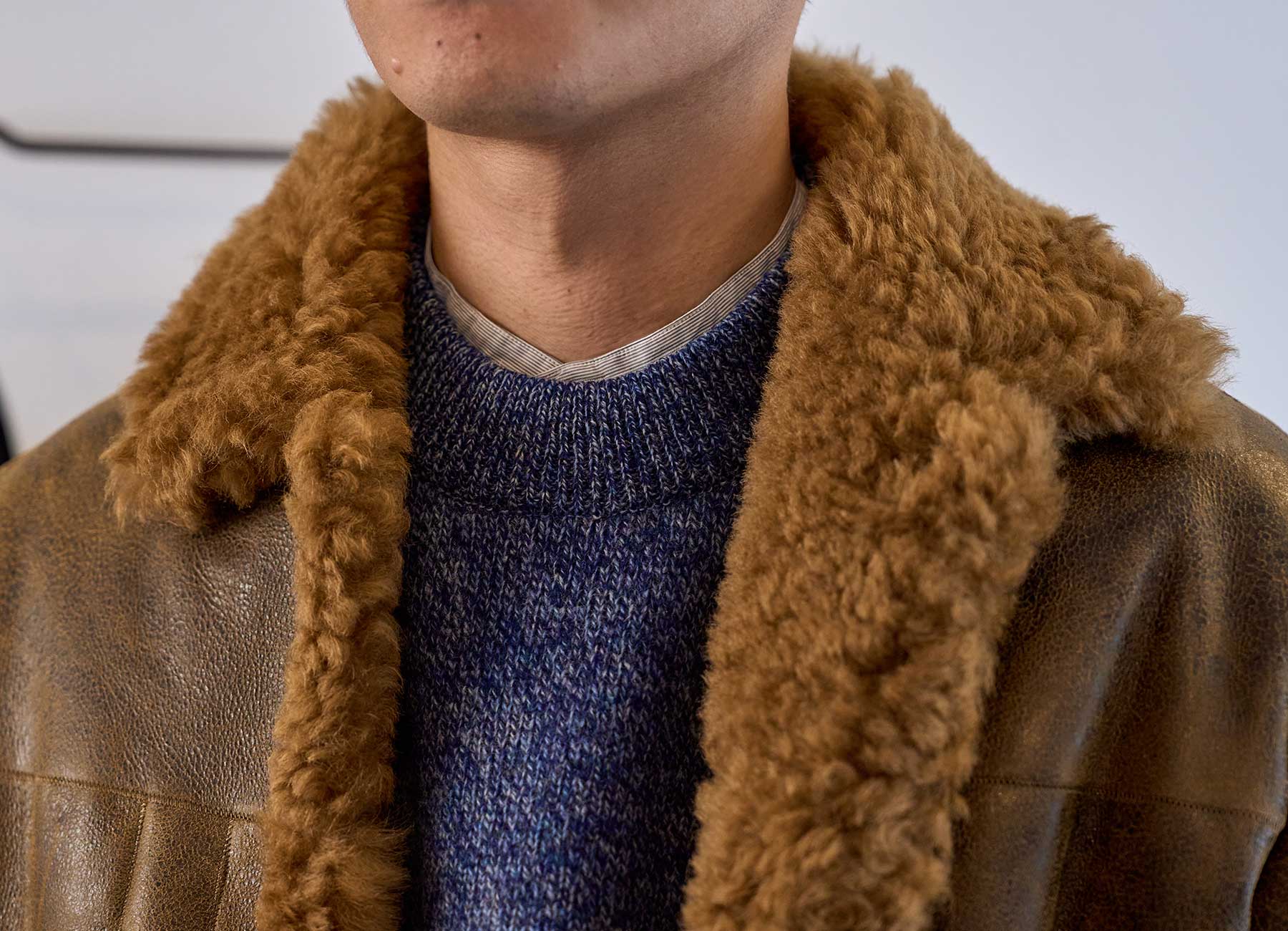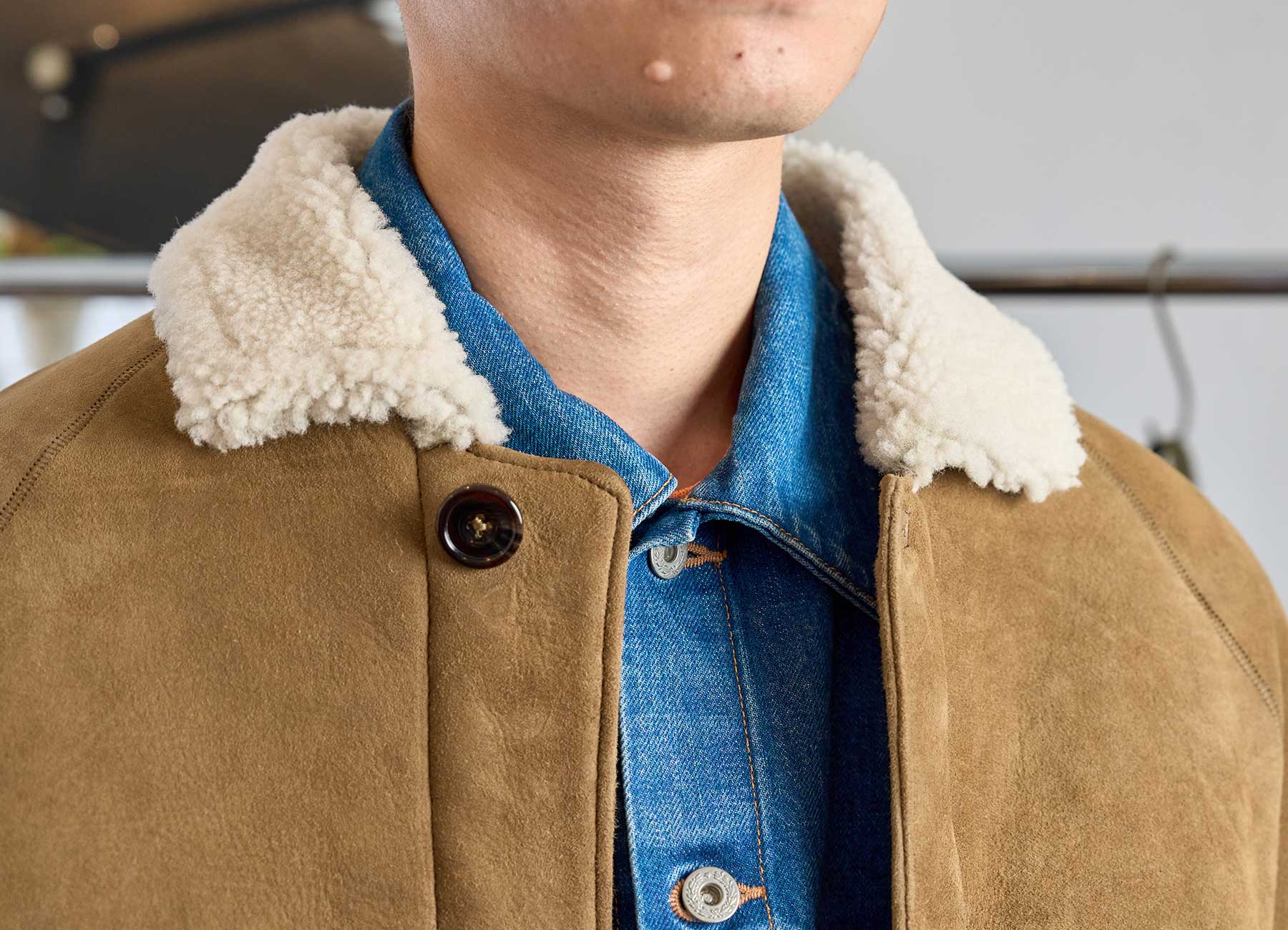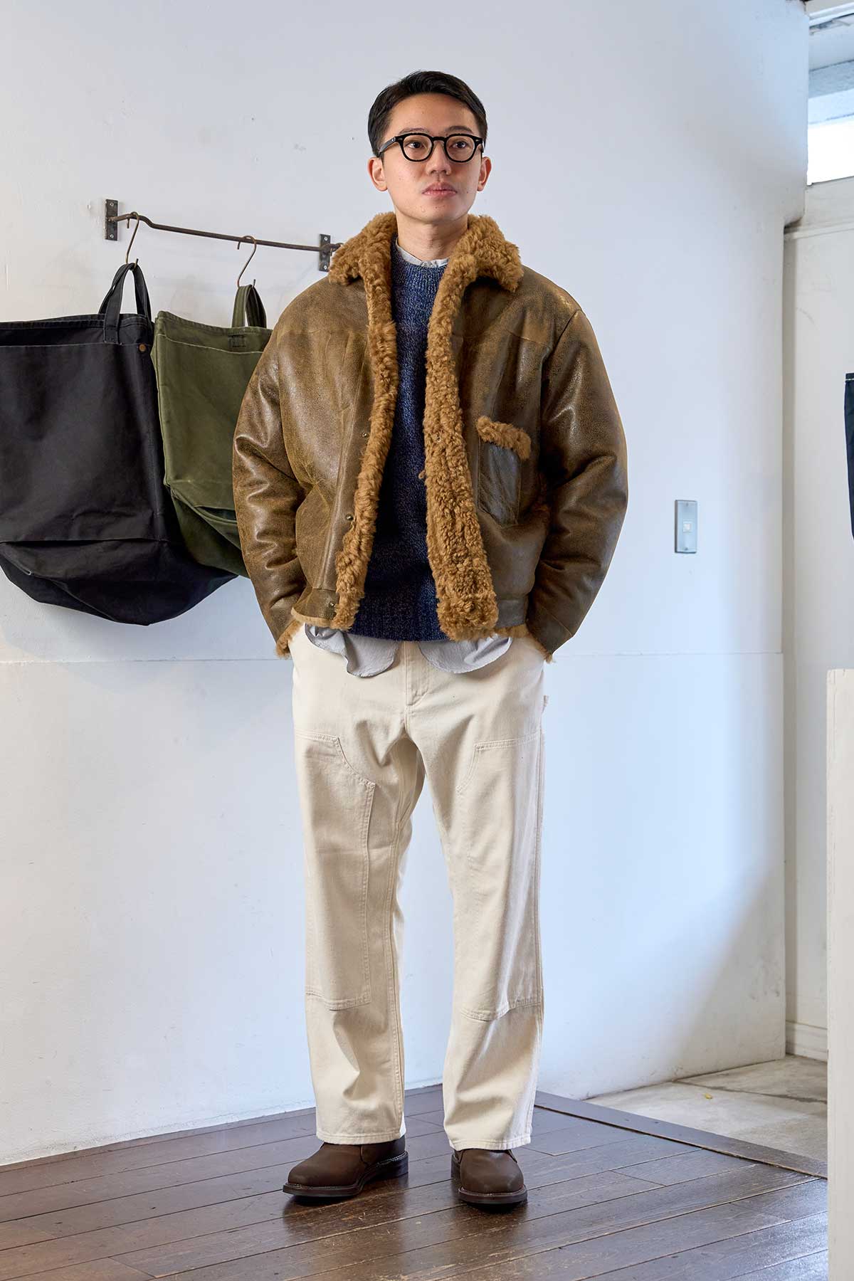 次はデニムジャケット型のムートンを使います。ブラウンのムートン、これは革の表情が面白いですね。パンツはゆったりとしたシルエットのホワイトのダブルニーペインターパンツで、ボリュームのあるトップスとのバランスをとっています。足元はトップスの革の色と表情に類似したラフアウトスエードのチャッカーブーツを合わせました。インナーにはピンストライプの生地を使った英国軍をモチーフにしたバンドカラーのオフィサーシャツにシェットランドウールのニットを重ねています。英国製ムートンJKTにシェットランドウール、英国軍オフィサーシャツ、英国ブーツと、ざっくりですが英国縛りでまとめました。ジャケットが重厚感あるので、インナーとボトムスを明るくして軽さを見せています。またペインターパンツの生地が柔らかいのでリラックスした感じも出ていますね。先ほど、このジャケットはアイスランド産のシープと聞いたけど、他のものより内側の毛足が長いですね。キレイ目にまとめるとムートンのボアのゴージャス感も落ち着いて見えるのではないでしょうか。