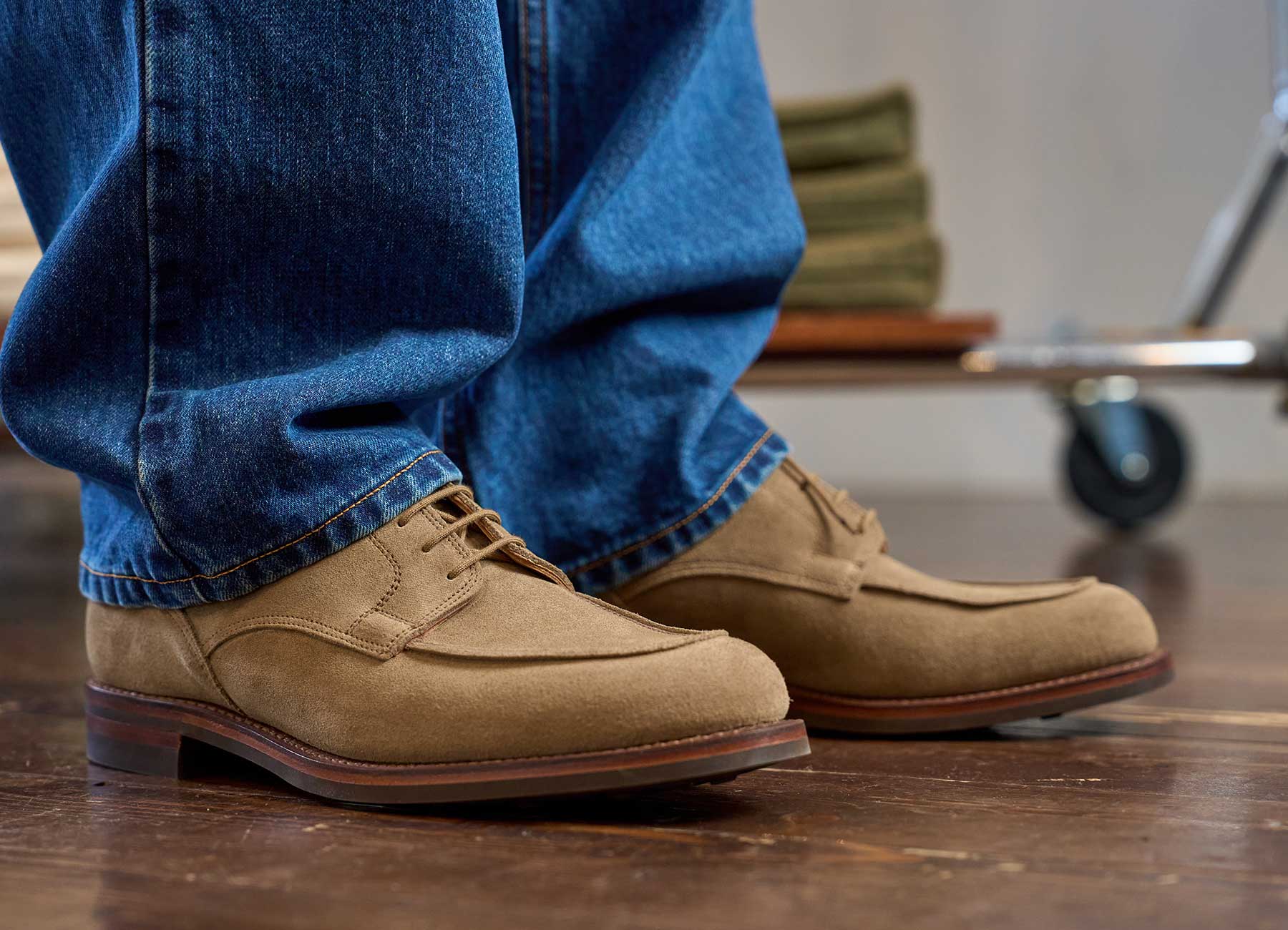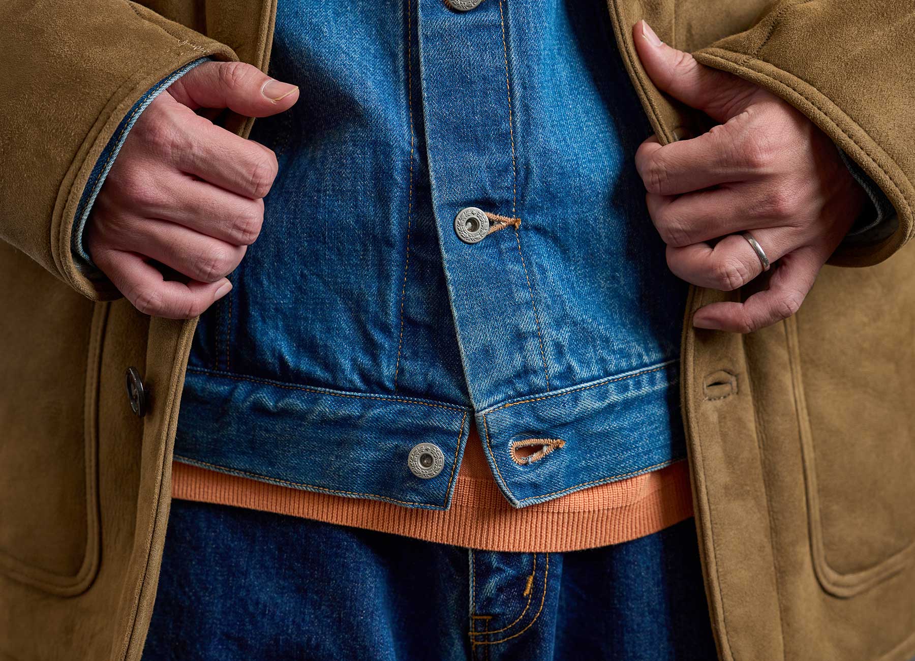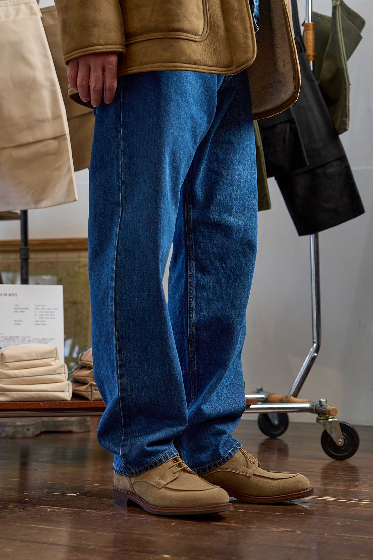次は、FUJITOのデニムのセットアップを使った男くさいコーディネイトです。イギリスのカントリーサイドのファーマーをイメージしてみました。インには程良くフェードしたデニムの「カウボーイジャケット」を着て、カバーオールタイプのムートンジャケットを合わせています。ムートンのライトブラウンとフェードしたインディゴの色の相性が非常に良いですね。男くさいとはいっても、街で着るにはもっさりとし過ぎたくないので、足元にはクロケット&ジョーンズの洗練されたモカ縫いのシューズを選んでシュッとしたシルエットを見せています。デニムジャケットの下にチラリと見え隠れしているのは、ロンT感覚で着ることができるコットンニットです。デニムジャケットとデニムパンツのステッチカラーを拾って、淡いオレンジカラーを選びました。