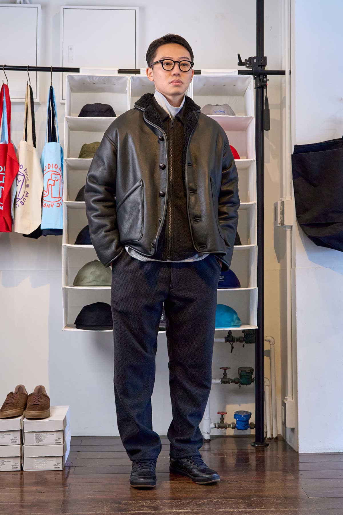 モノトーンのコーディネートを組んでみました。イメージはイギリスの若いギャング。FUJITOのウール素材を使ったトラックスーツをセットアップで着て、足元はアディダスのスケーターシューズ、そこに本来なら蚤の市で買ったような古着のムートンを着たりするところを、表革風な艶感のあるムートンジャケットを合わせてみました。少しだけ不良の匂いとストリートの香りがするのではないでしょうか。インナーにはコットンのタートルネックを着ています。このムートンジャケットは前身丈と後身丈で落差があるので、それを生かして少しだけ後ろに抜いた感じで着てもらいました。