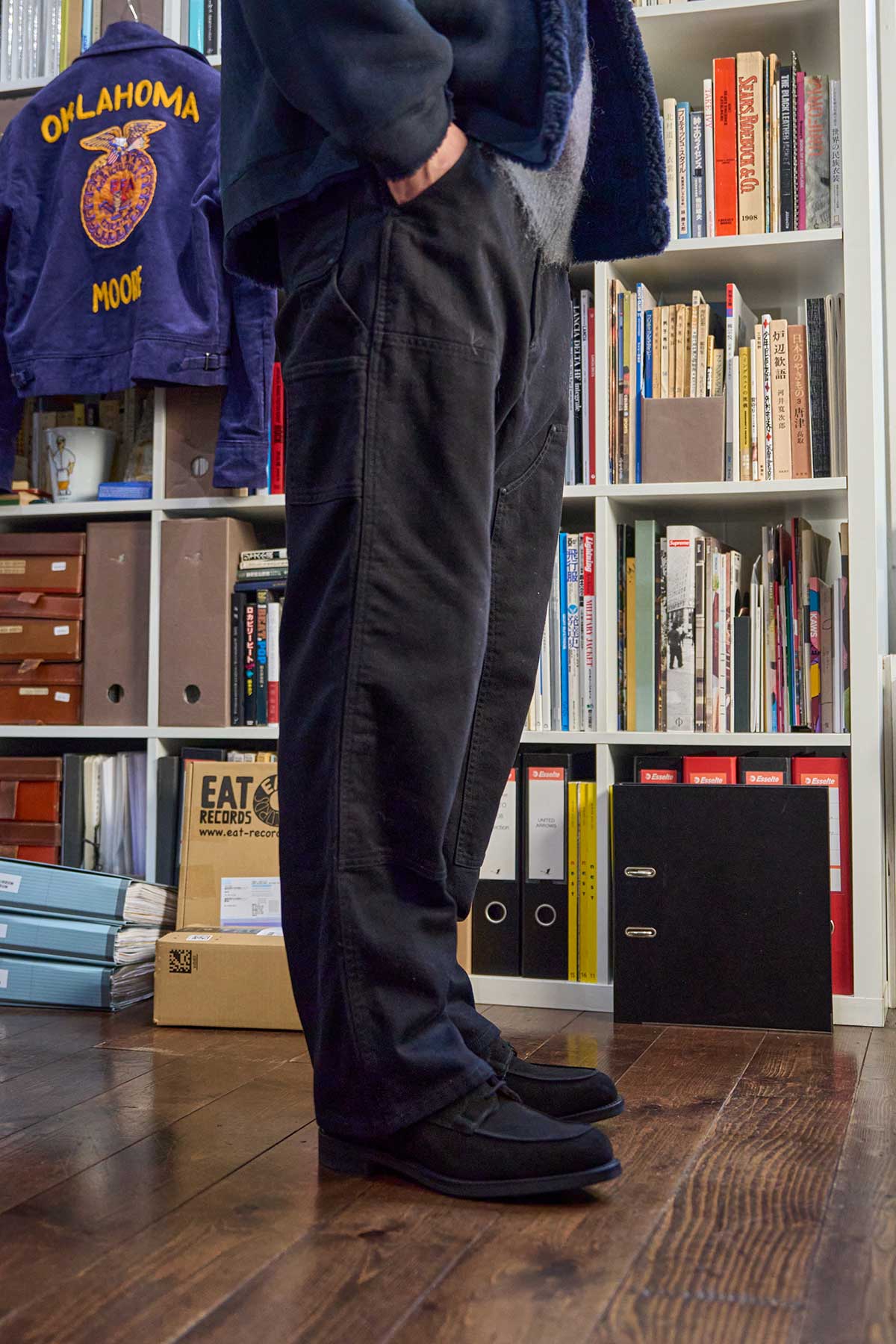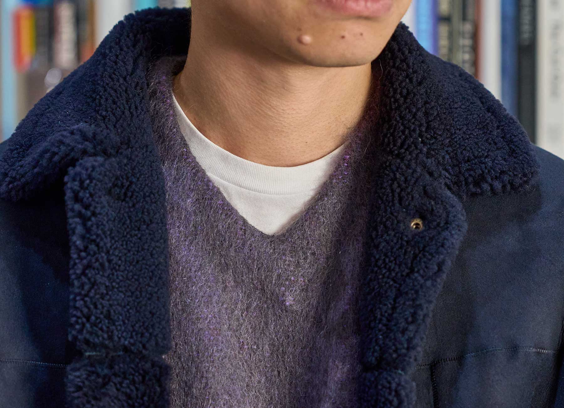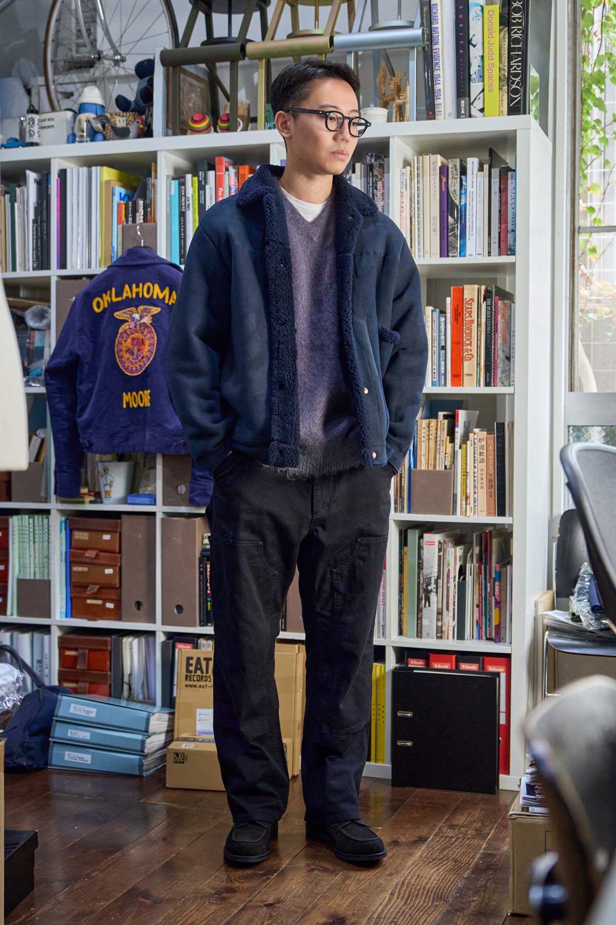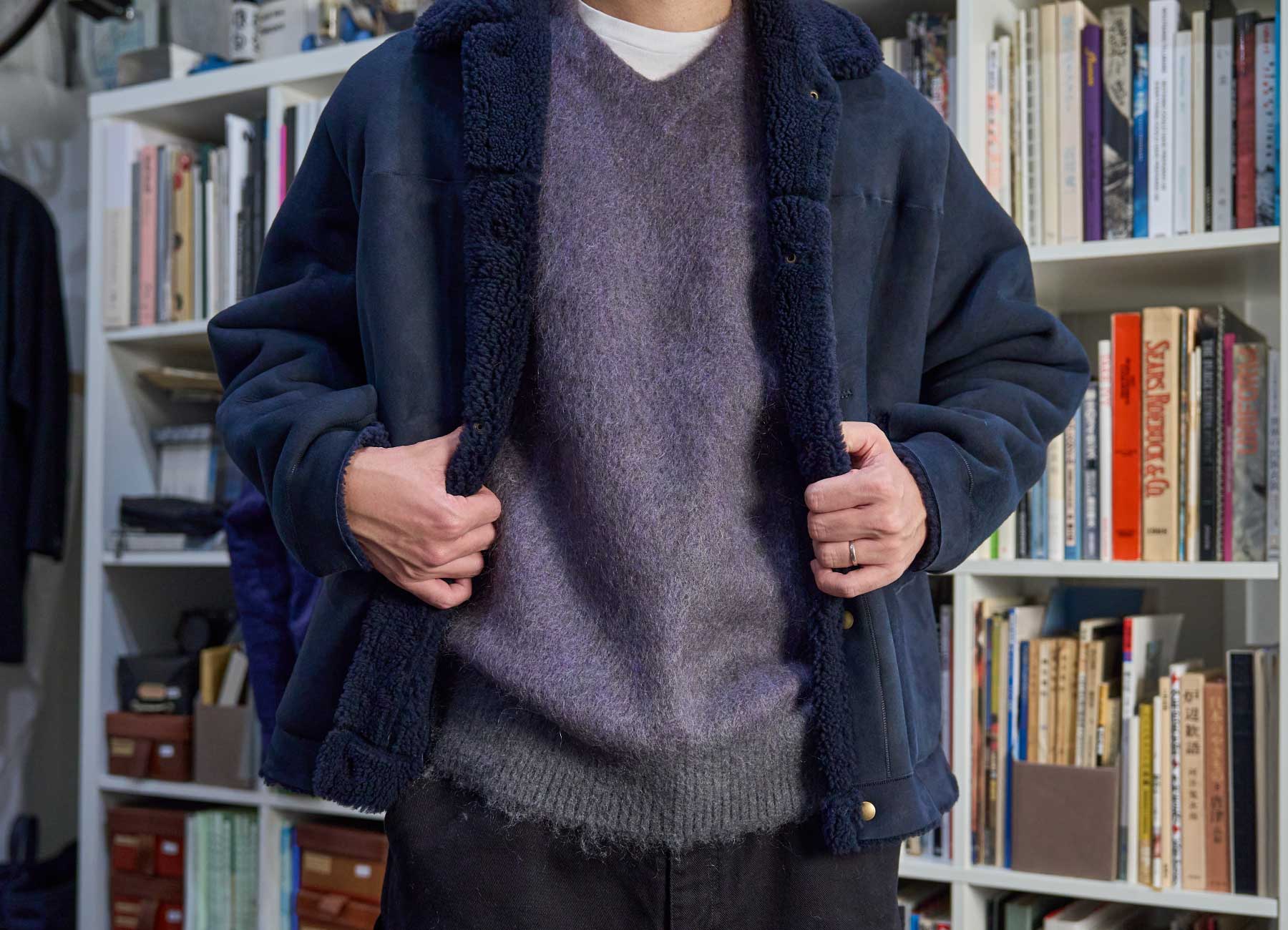 最後になります。ムートンはGジャンタイプのネイビーです。ネイビーの色をはっきりと際立たせたいのでブラックのダブルニーペインターパンツにブラックスエードの靴と下半身はブラックで統一しました。インナーはモヘアを使ったVネックセーターです。編み立てた後に職人が起毛加工していてふわふわとしたシャギーな毛並みです。ミックス調のグレイッシュなパープルカラーで、インナーに少しだけ明るい色を持ってくることで軽い雰囲気に仕上げてみました。ムートンジャケットも見た目に反して軽いので、パンツ、ニットも柔らかくて軽い素材を選ぶことで楽な着心地を意識しています。わがままボディにも嬉しいリラックスしたコーディネートです(笑)。