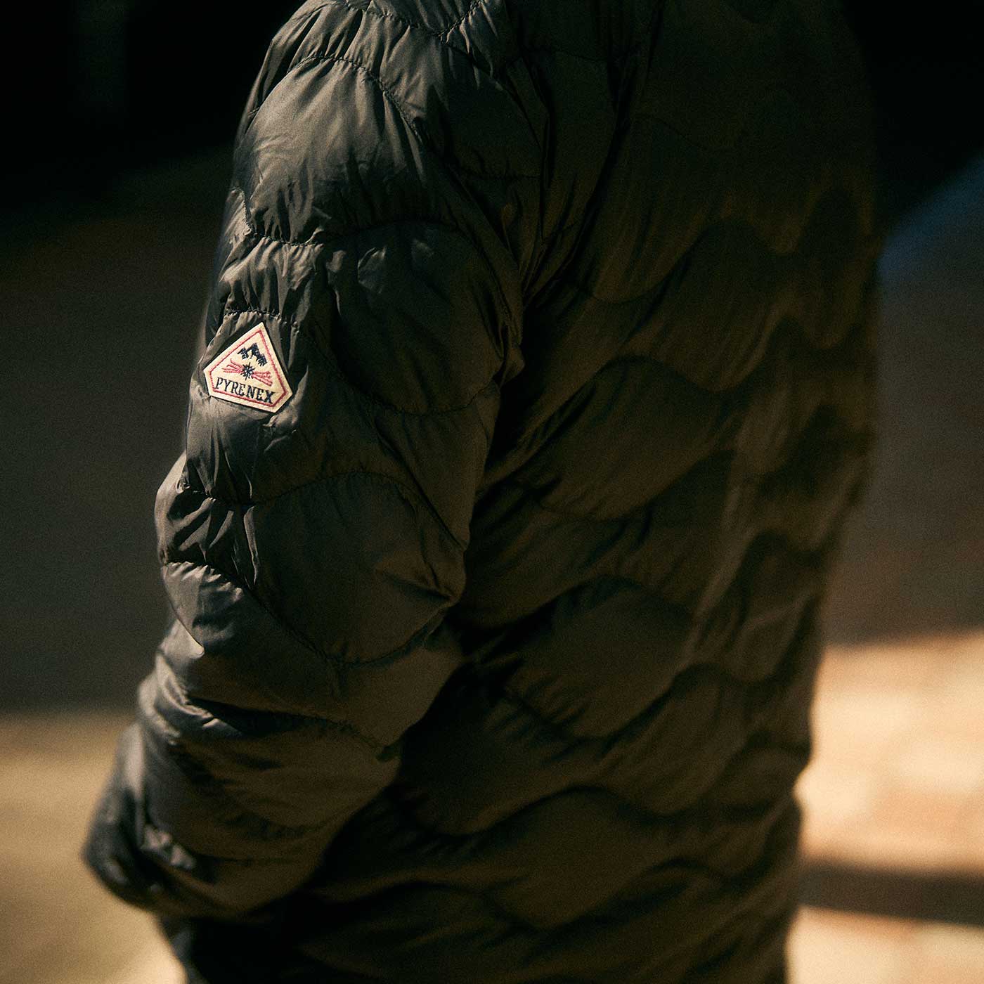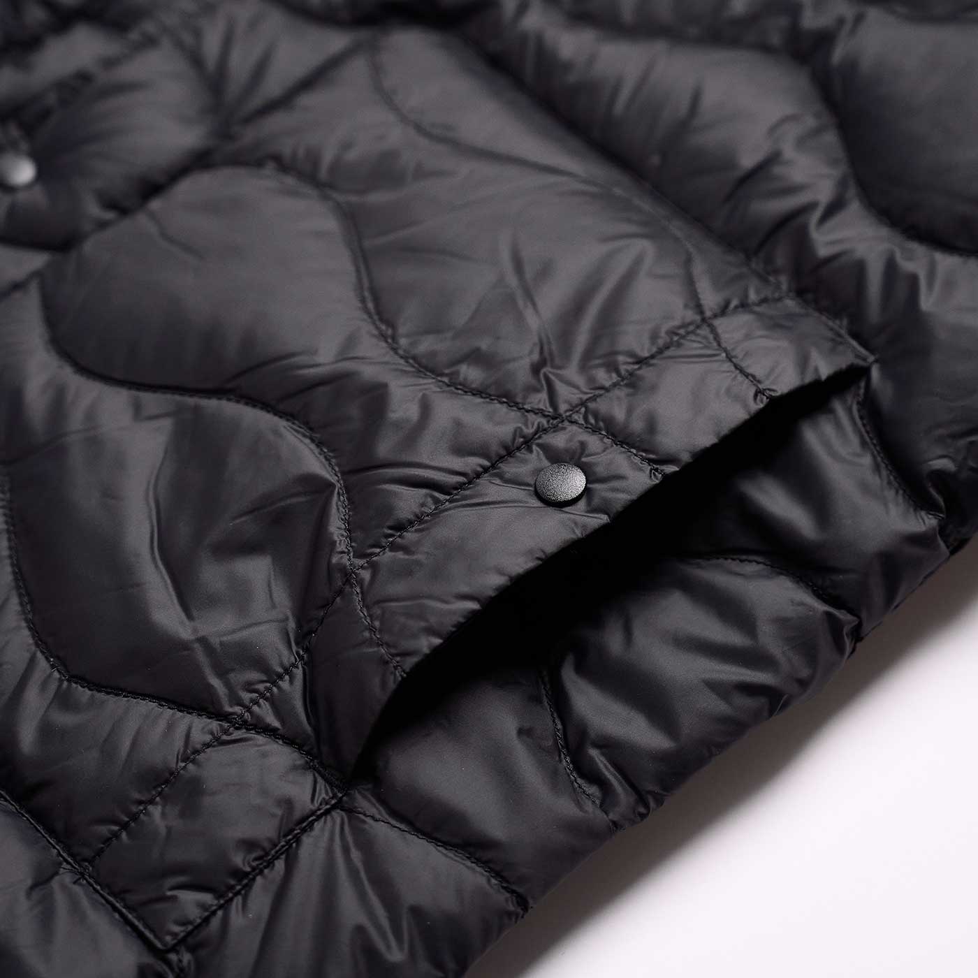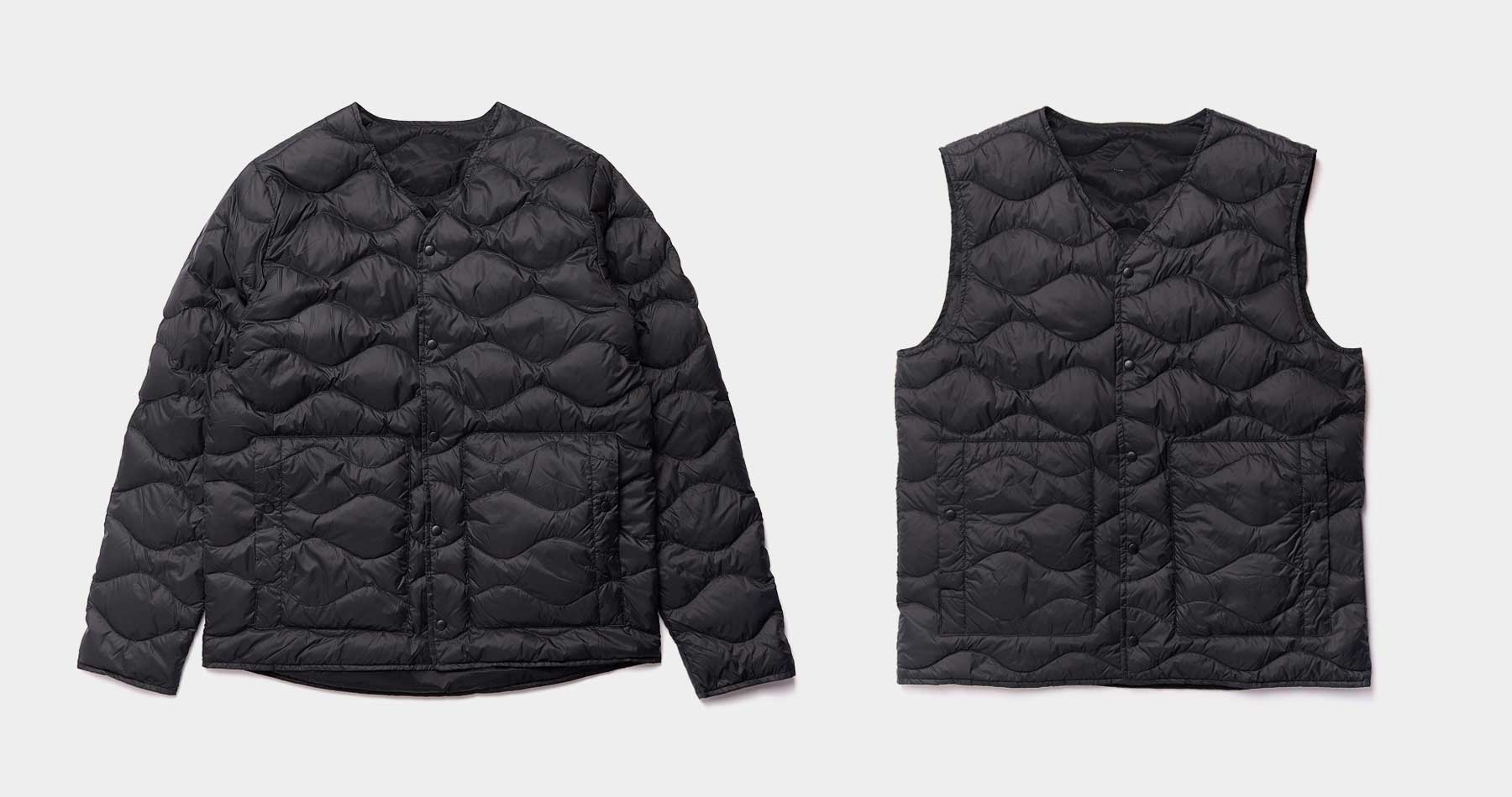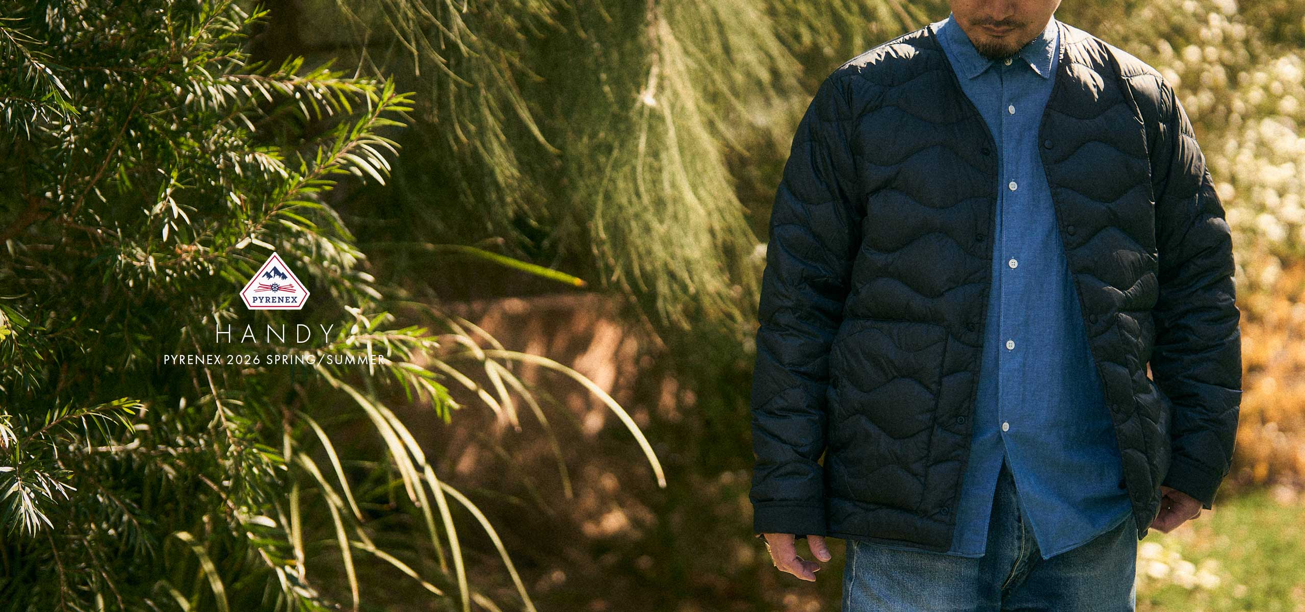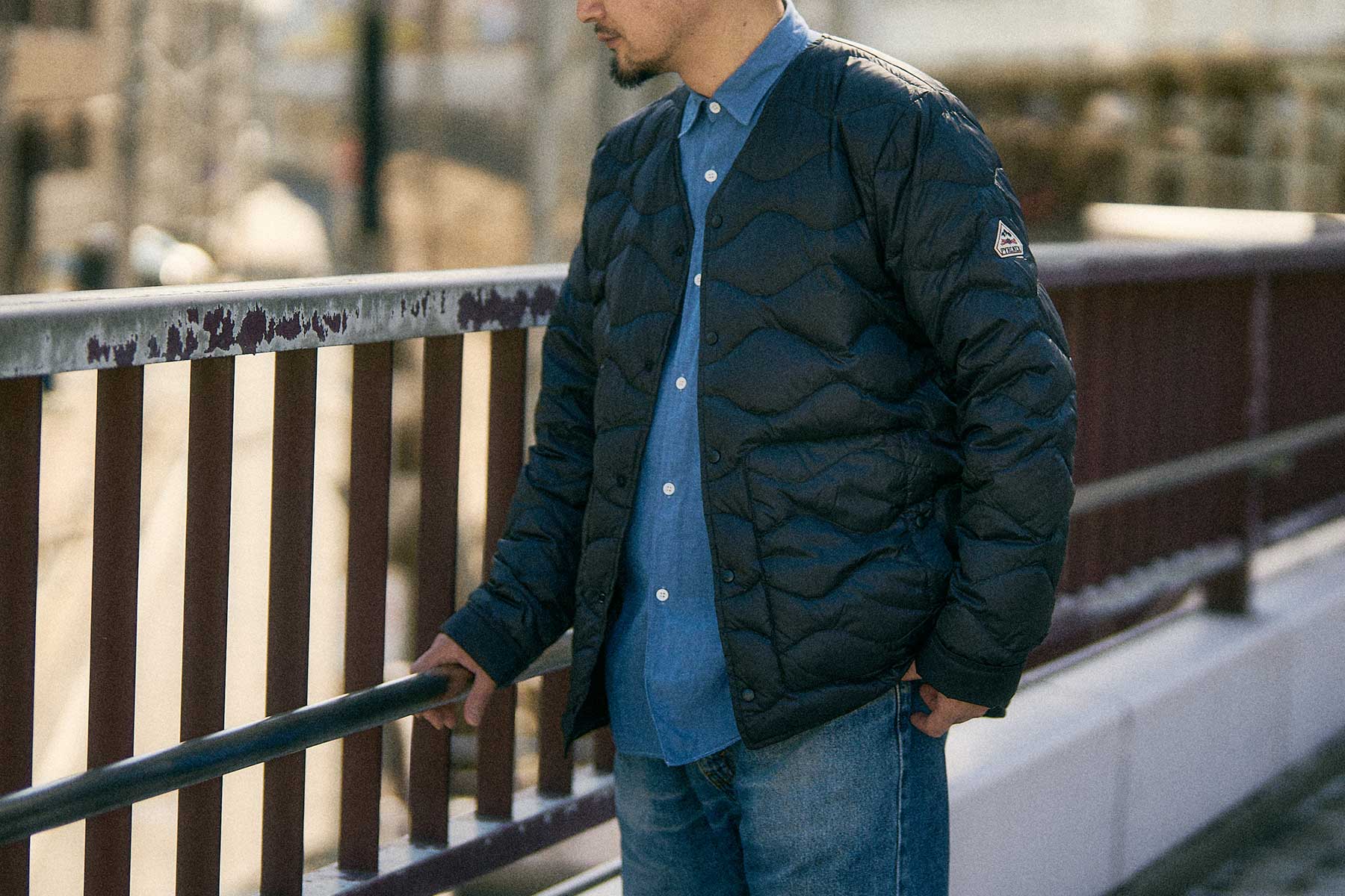 超軽量ファブリックと高品質なフレンチダックダウンを組み合わせることで軽い着心地と適度な保温性を兼ね備えた最軽量クラスのライトウエイトダウンジャケット。フロントがスナップボタン仕様になったカーディガンタイプで、ダウンの充填量を抑えることで外気温に合わせてアウターとしてもインナーとしても着用できる3シーズン対応です。首回りは立ち襟やフーディではなく、見ためも軽いVネック。インナーにはタートルネックやクルーネック、シャツ襟とも親和性が良い点も高ポイントです。ミリタリーライナーを彷彿とさせるオニオンキルトステッチがタウンユースで映えます。同デザインのベスト「HANDY VEST」も展開。
