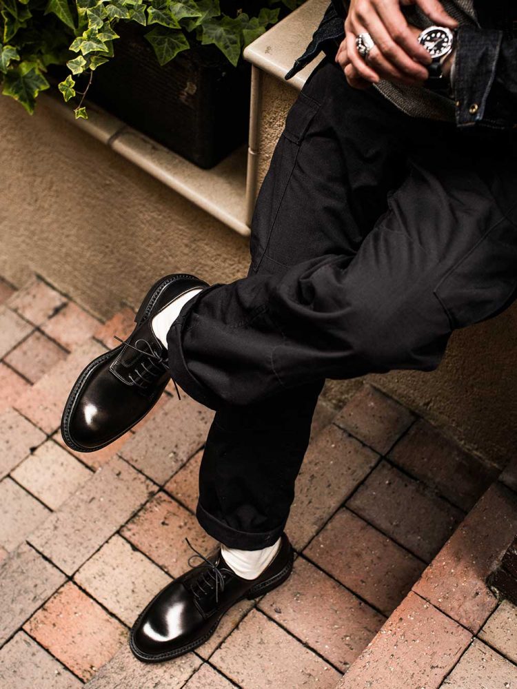「デザイナーの藤戸剛さんが大好物だと自称するシープスキンウエアでスタイリング」