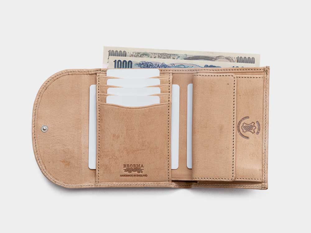 ラウンドしたフラップがアイコニックな「三つ折りウォレット」は、抜群の収容性と携帯しやすい手頃なサイズ感のバランスが絶妙です。札入れと大型のコインケースのほかに4室のカードポケットと3室のマルチポケットを備えています。使い始めこそ堅いヴィンテージブライドルレザーは、使うほどに次第に手に馴染み、経年変化によって味わいと美しさが増します。