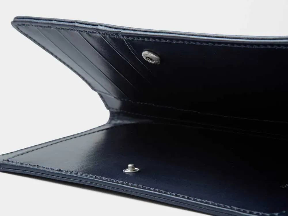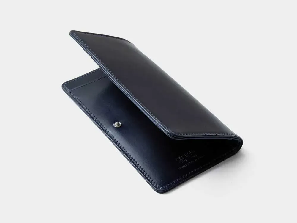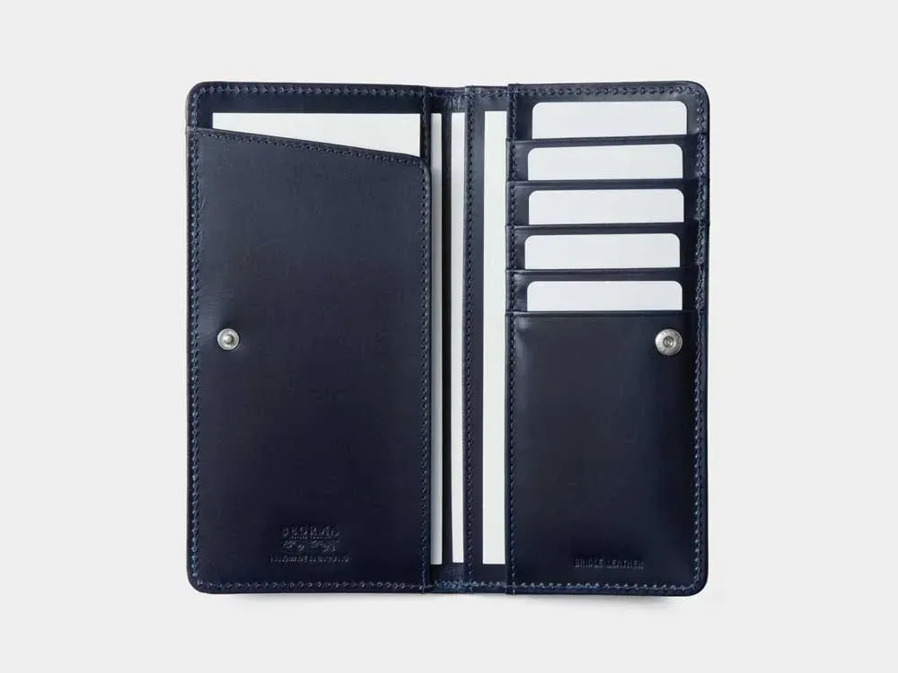 S0049「スリムスナップロングウォレット」はマチをなくすことでスリムに仕上げたロングウォレットです。カードポケットが5つと紙幣やレシートが入る幅広なビルポケットが3つ、スムーズな出し入れができる2辺が開いたスリットポケットをひとつ備えることで使いやすさも重視、スナップボタンで留めることでスリムなフォルムに収まります。上質なイングリッシュブライドルレザーを使用しており重厚な素材感が魅力です。