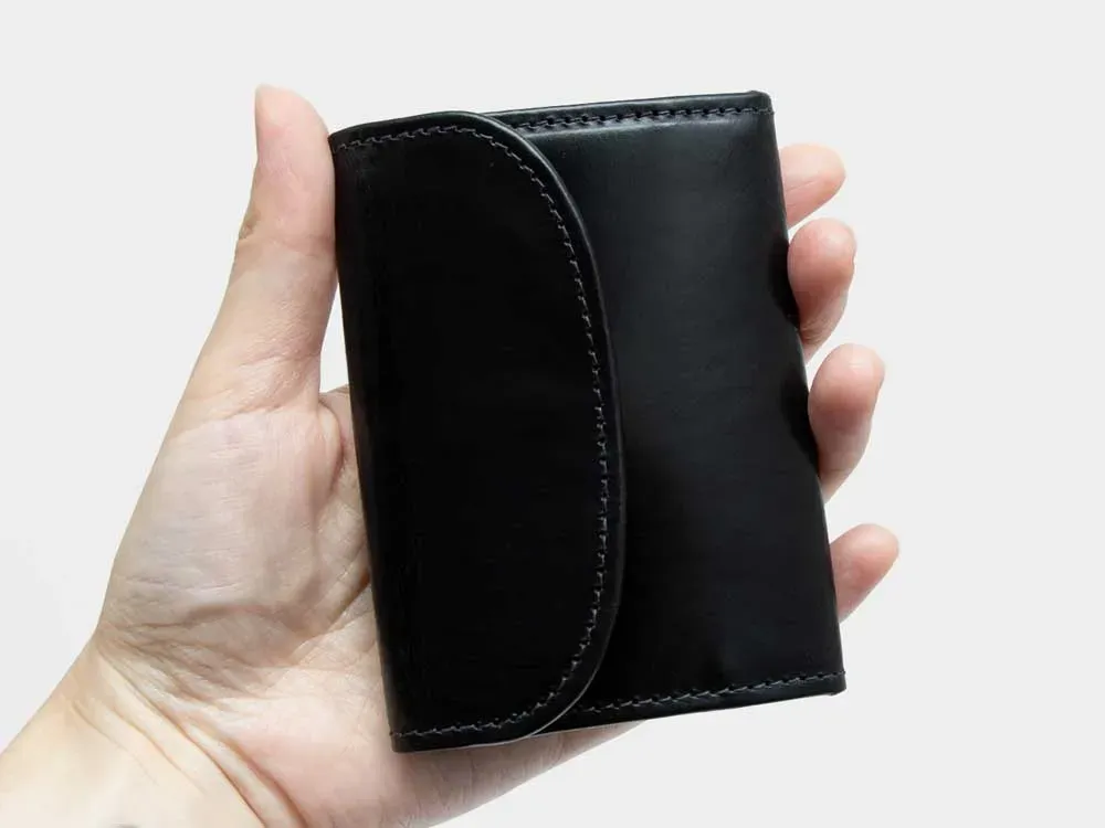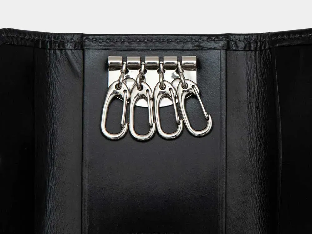 三つ折りデザインのキーケースは表・内面ともに上質なブリティッシュブライドルレザーを贅沢に使った重厚な素材感が魅力です。4連のキーフックをつけたクラシックなスタイルですが、二つのカードポケットを備えており、カードキーの収納にも対応しています。日常で携帯しやすいコンパクトなサイズです。