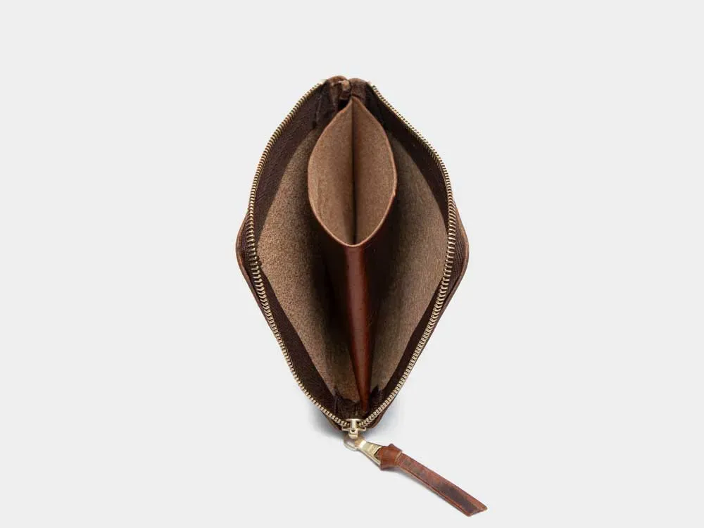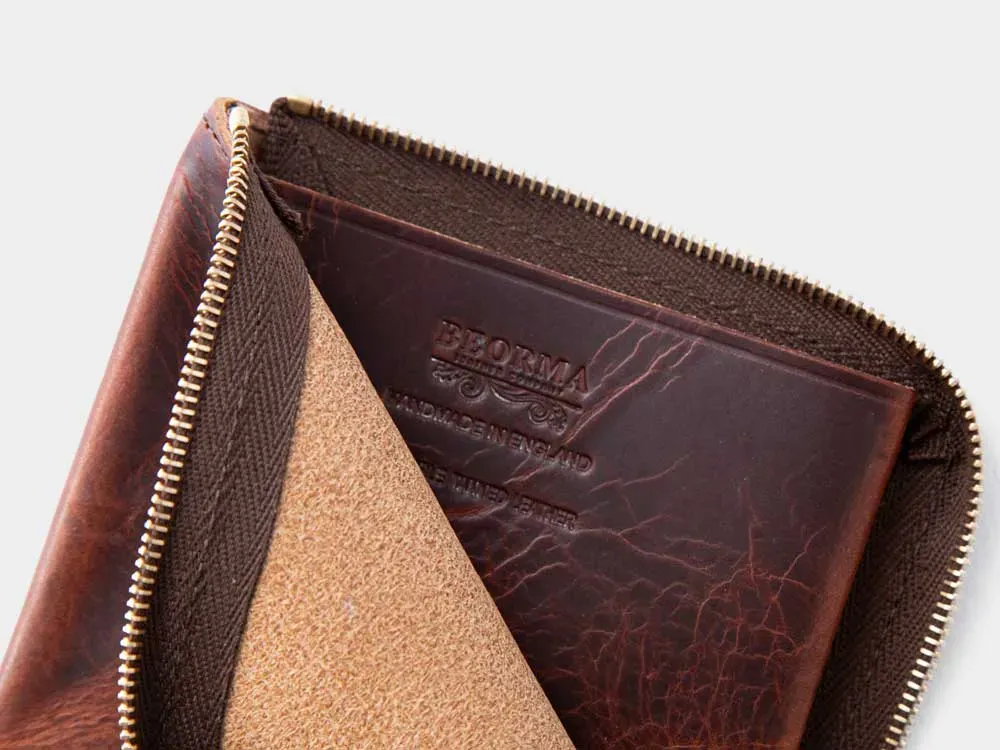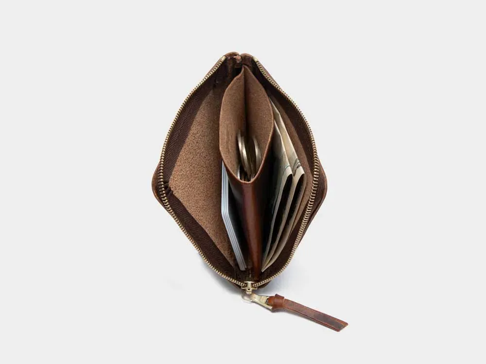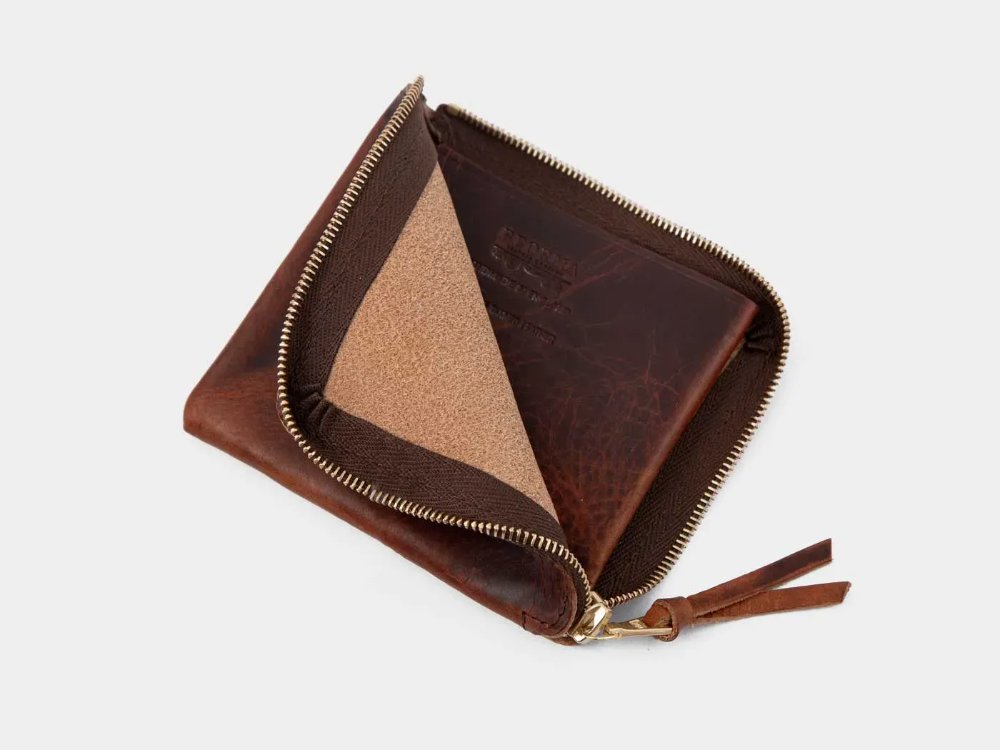 L字型ジップで開閉する手のひらサイズのコンパクトウォレットです。内部中央には仕切りとなるコインポケットが備わっており、その両側に二つ折りの紙幣、カード類を収容できます。