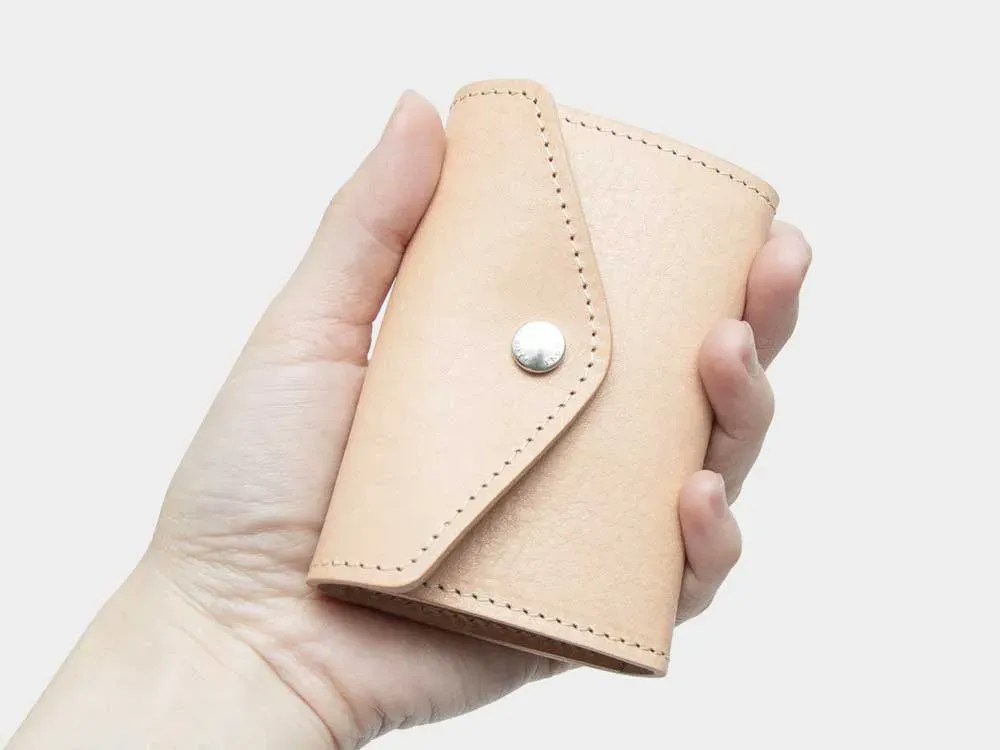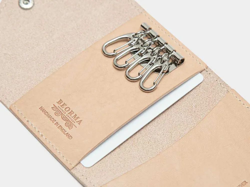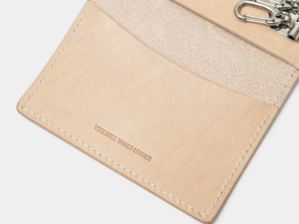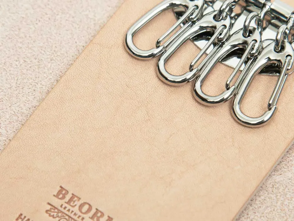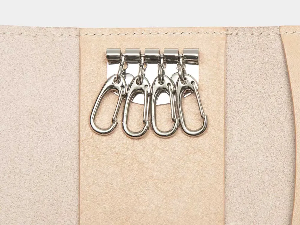 上質な北欧レザーを使用した三つ折りデザインのキーケースは、柔らかな素材感による素朴で温和な雰囲気が魅力です。4連のキーフックをつけたクラシックなスタイルですが、二つのカードポケットを備えており、カードキーの収納にも対応しています。日常で携帯しやすいコンパクトなサイズです。