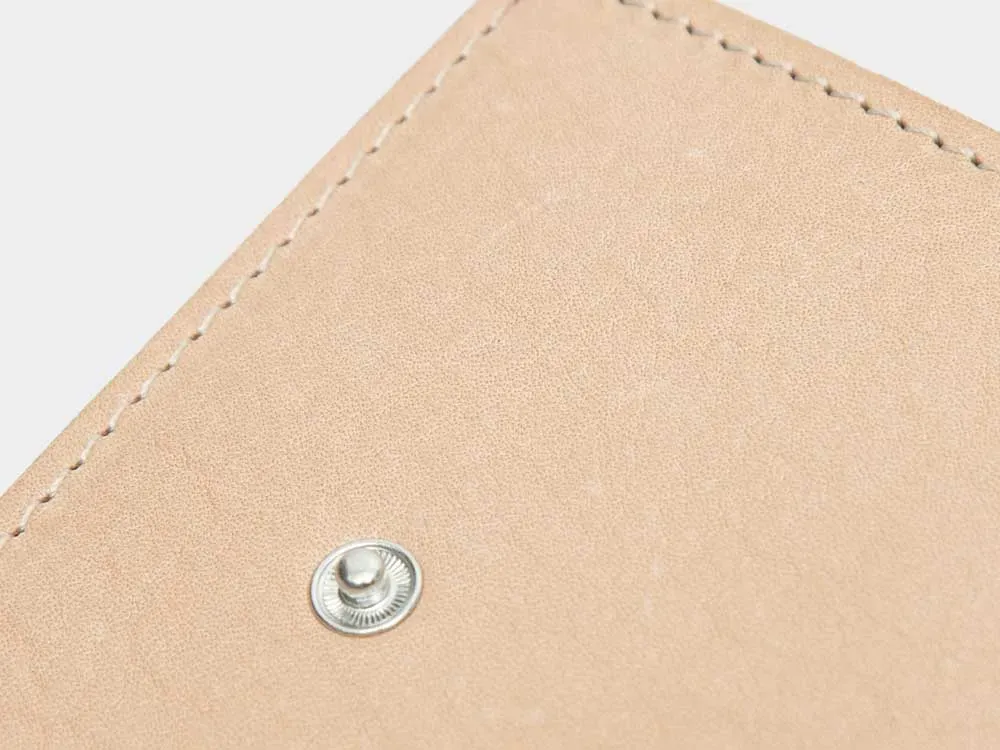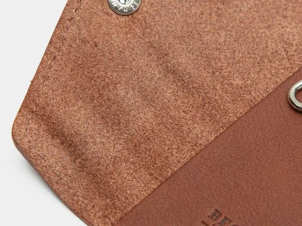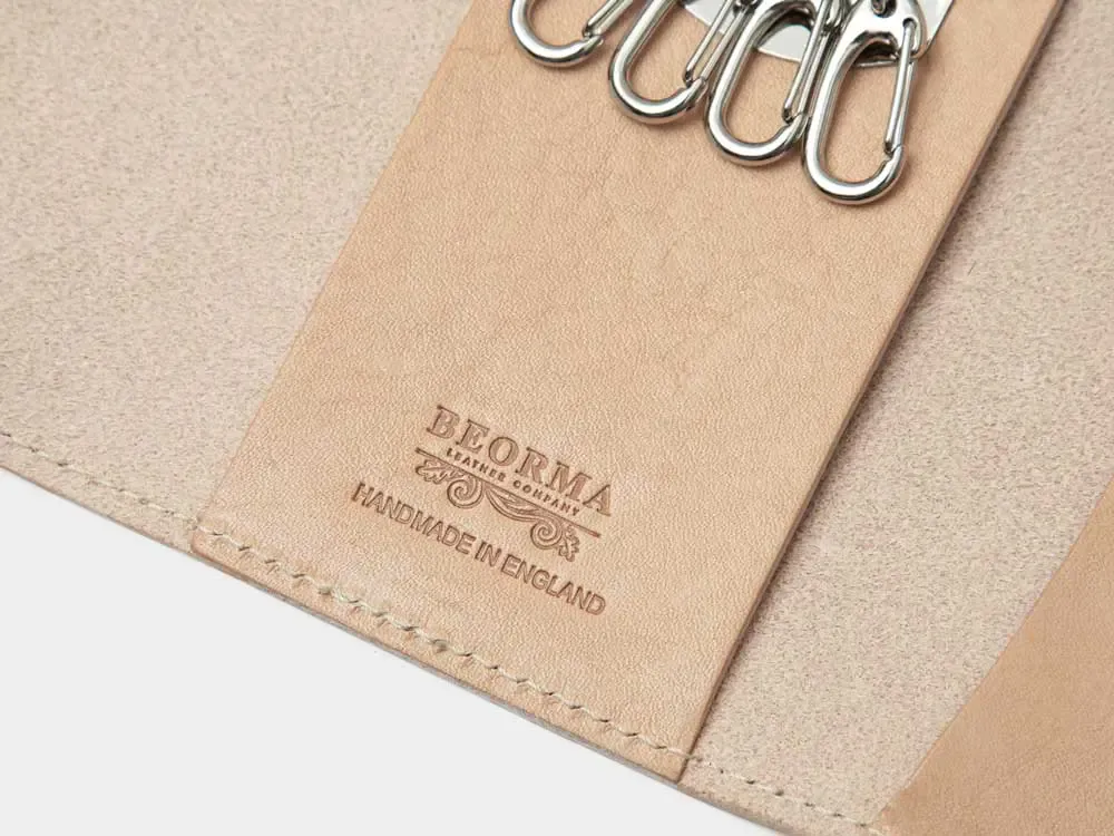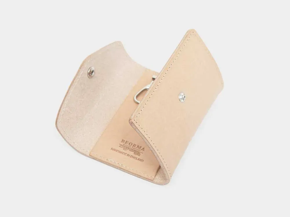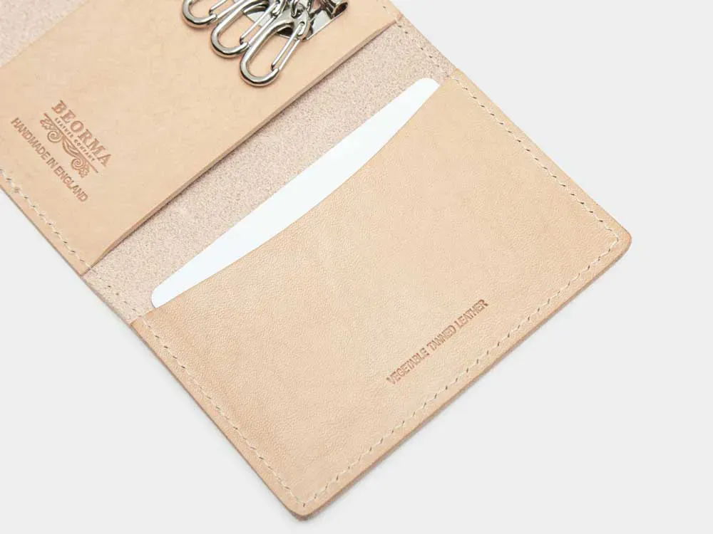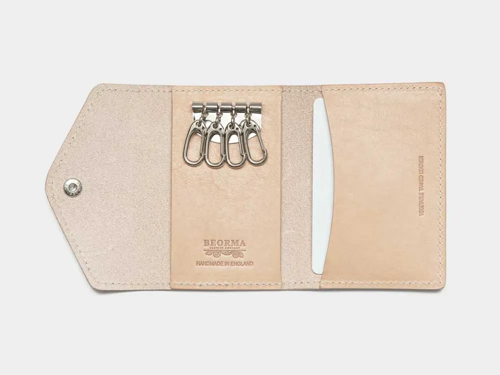 上質な北欧レザーを使用した三つ折りデザインのキーケースは、柔らかな素材感による素朴で温和な雰囲気が魅力です。4連のキーフックをつけたクラシックなスタイルですが、二つのカードポケットを備えており、カードキーの収納にも対応しています。日常で携帯しやすいコンパクトなサイズです。