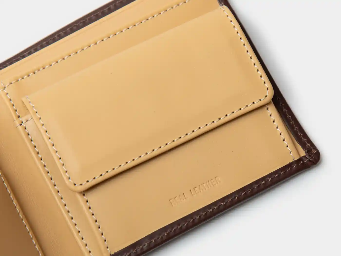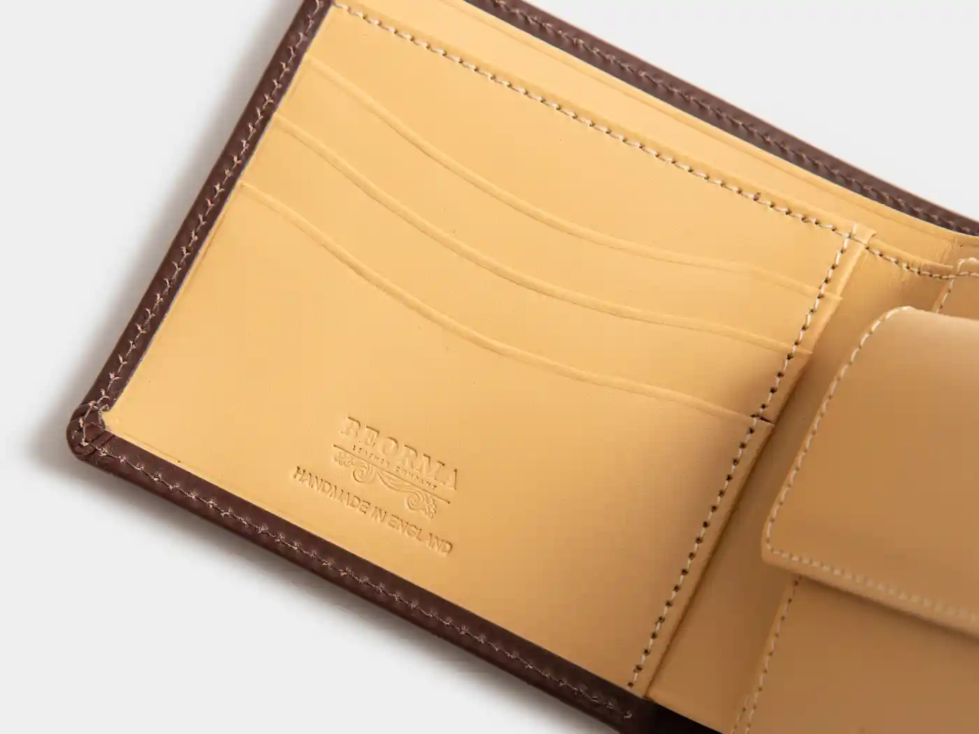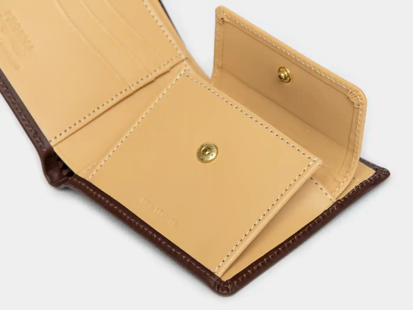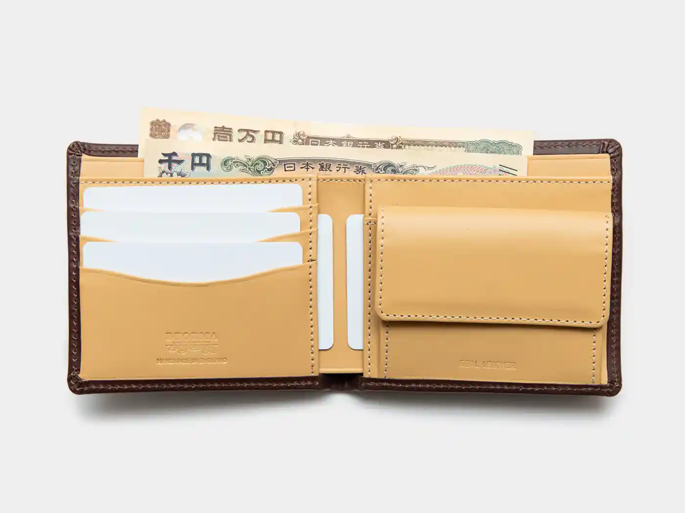 トラディショナルな財布の基本形とも言える最もスタンダードなデザインの二つ折りウォレット。シンプルに見えて実は手間の掛かる構造で、作業工程は複雑の為、それを堅牢な革で仕上げるには熟練した技術を要します。2室に分かれた札入れとコインケース、そして3室のカードポケットと2室のマルチポケットを備えています。