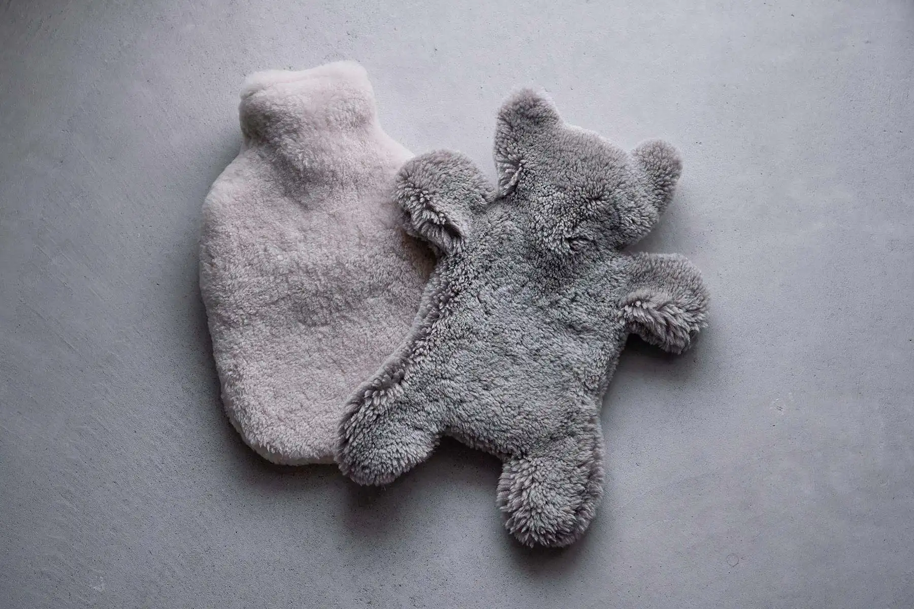 ふわふわで柔らかなシープスキンを使用し、丁寧にハンドクラフトされたテディベア型の湯たんぽカバー「フラット・エリック」。