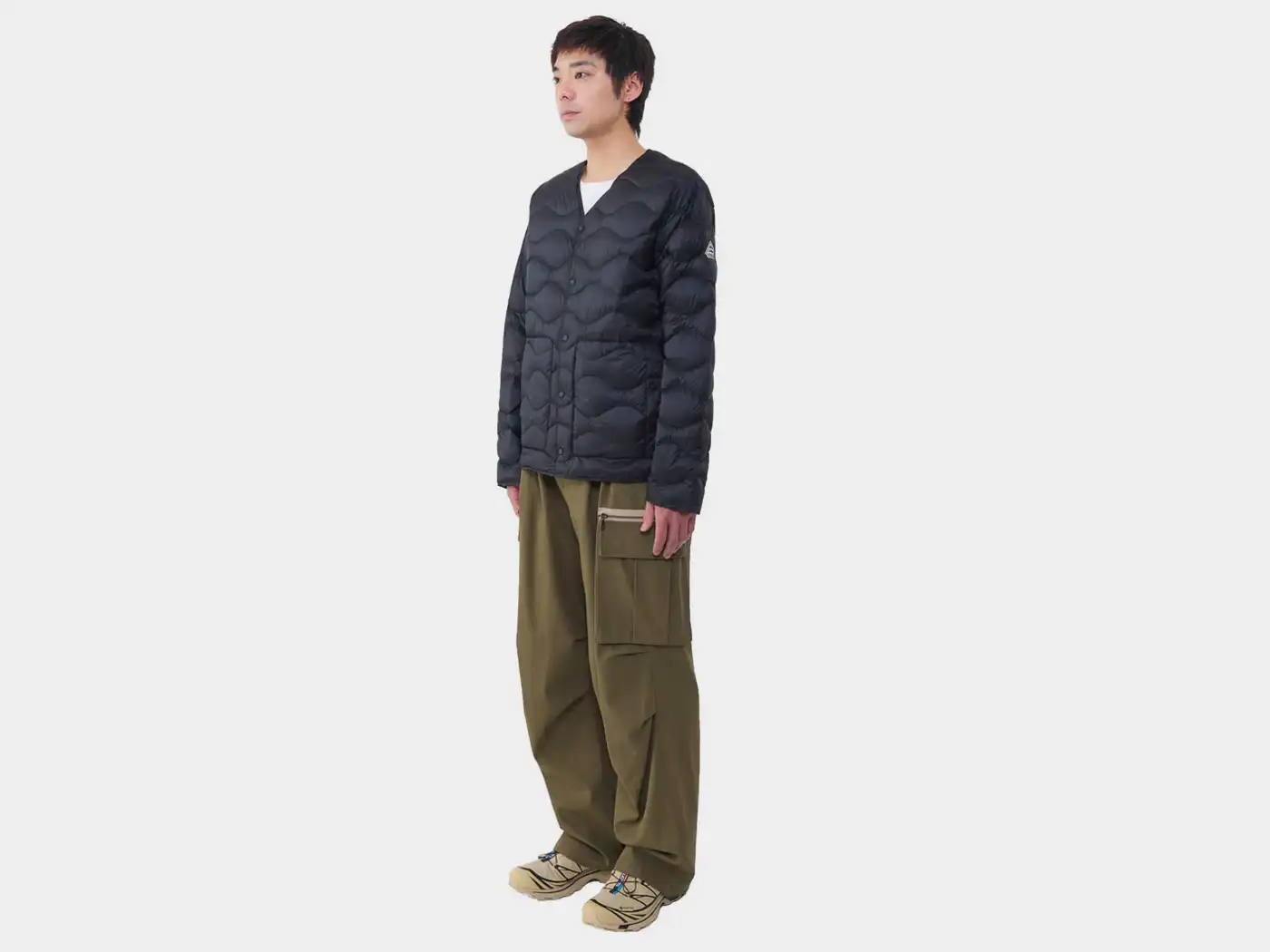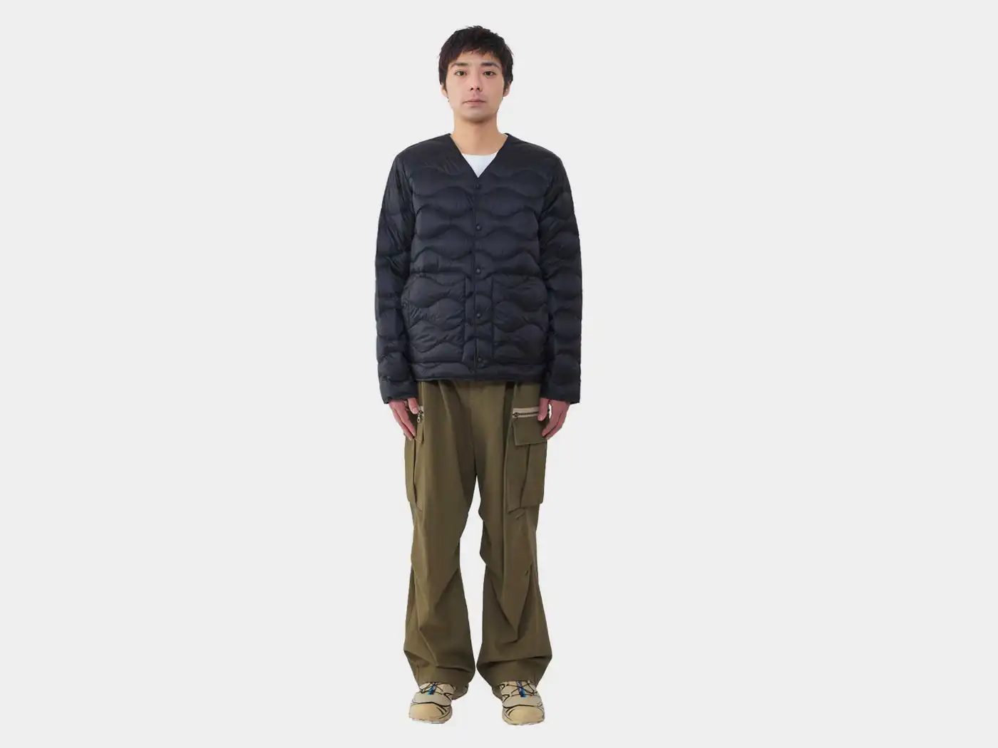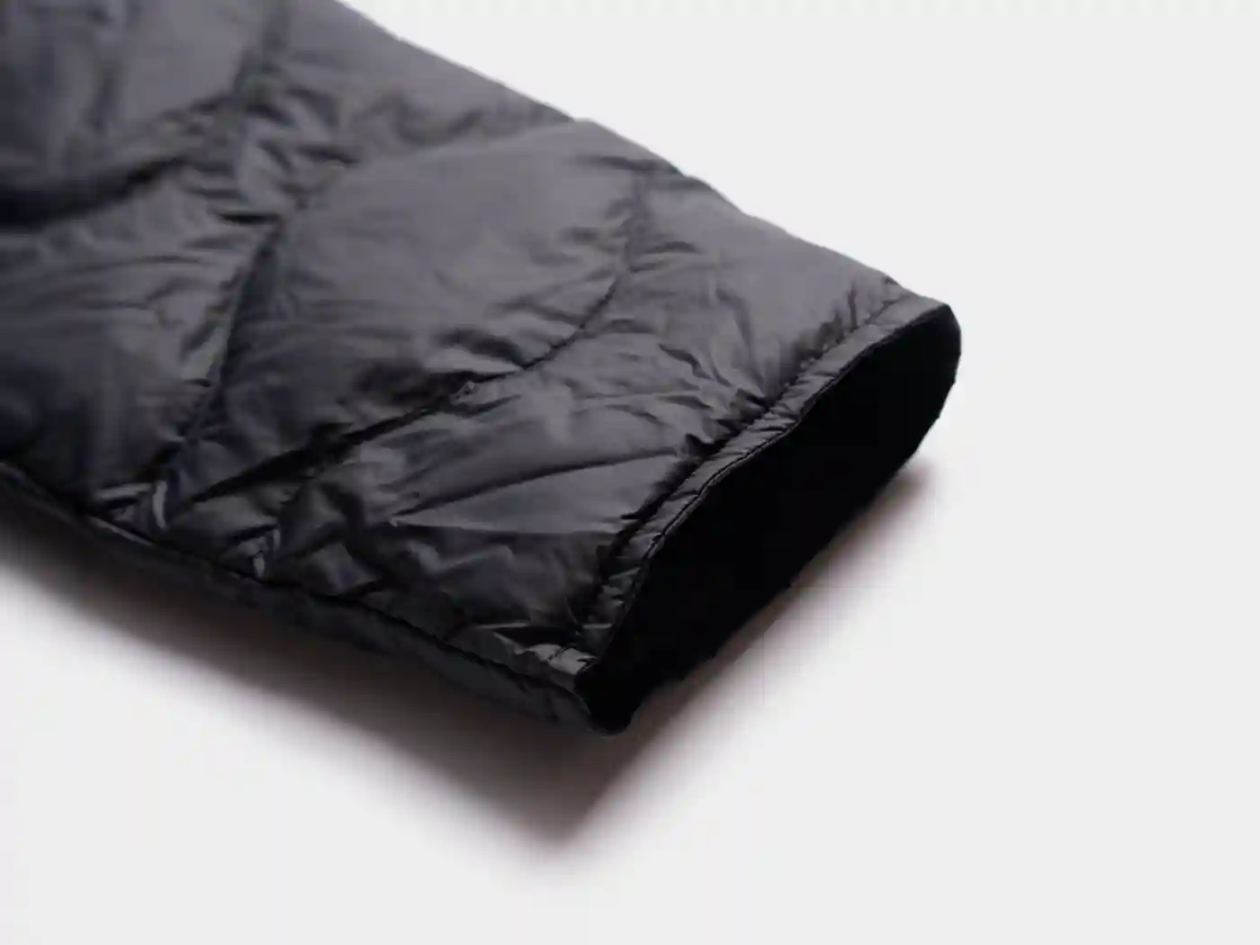 超軽量ファブリックと高品質なフレンチダックダウンを組み合わせることで軽い着心地と適度な保温性を兼ね備えたライトウエイトダウンジャケットです。フロントはVネックとスナップボタン仕様になったカーディガンタイプで、ダウンの充填量を抑えることで外気温に合わせてアウターとしてもインナーとしても着用できる3シーズン対応です。収納力がある大きめのパッチポケットを備えており、ミリタリーライナーを彷彿とさせるオニオンキルトステッチが特徴です。