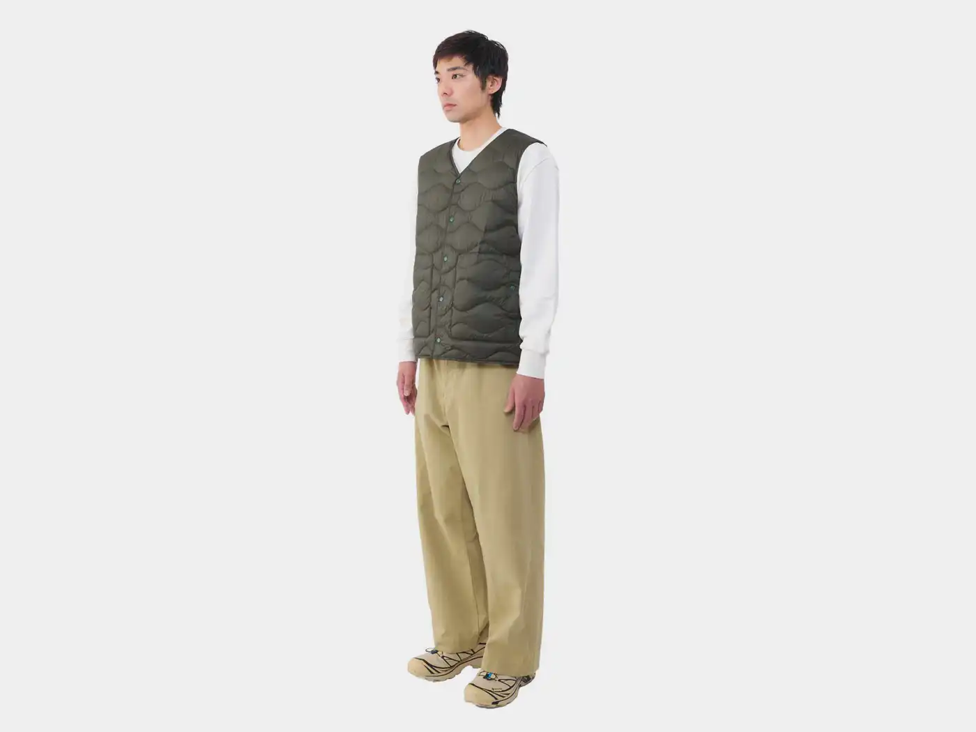 超軽量ファブリックと高品質なフレンチダックダウンを組み合わせることで軽い着心地と適度な保温性を兼ね備えたライトウエイトベストです。フロントはVネックとスナップボタン仕様で、ダウンの充填量を抑えることで外気温に合わせてアウターとしてもインナーとしても着用できる3シーズン対応です。収納力がある大きめのパッチポケットを備えており、ミリタリーライナーを彷彿とさせるオニオンキルトステッチが特徴です。