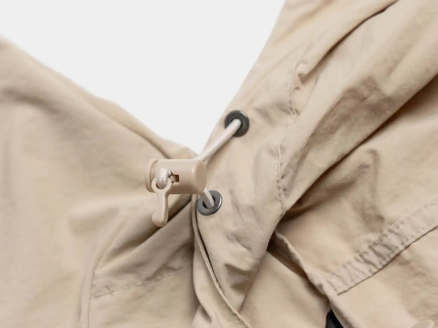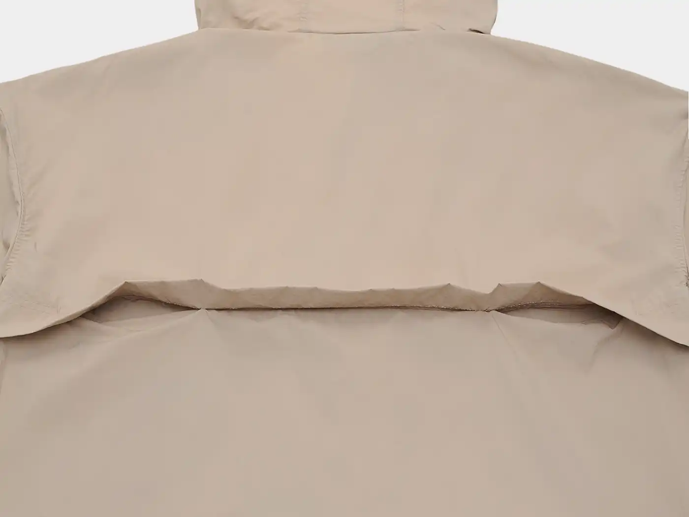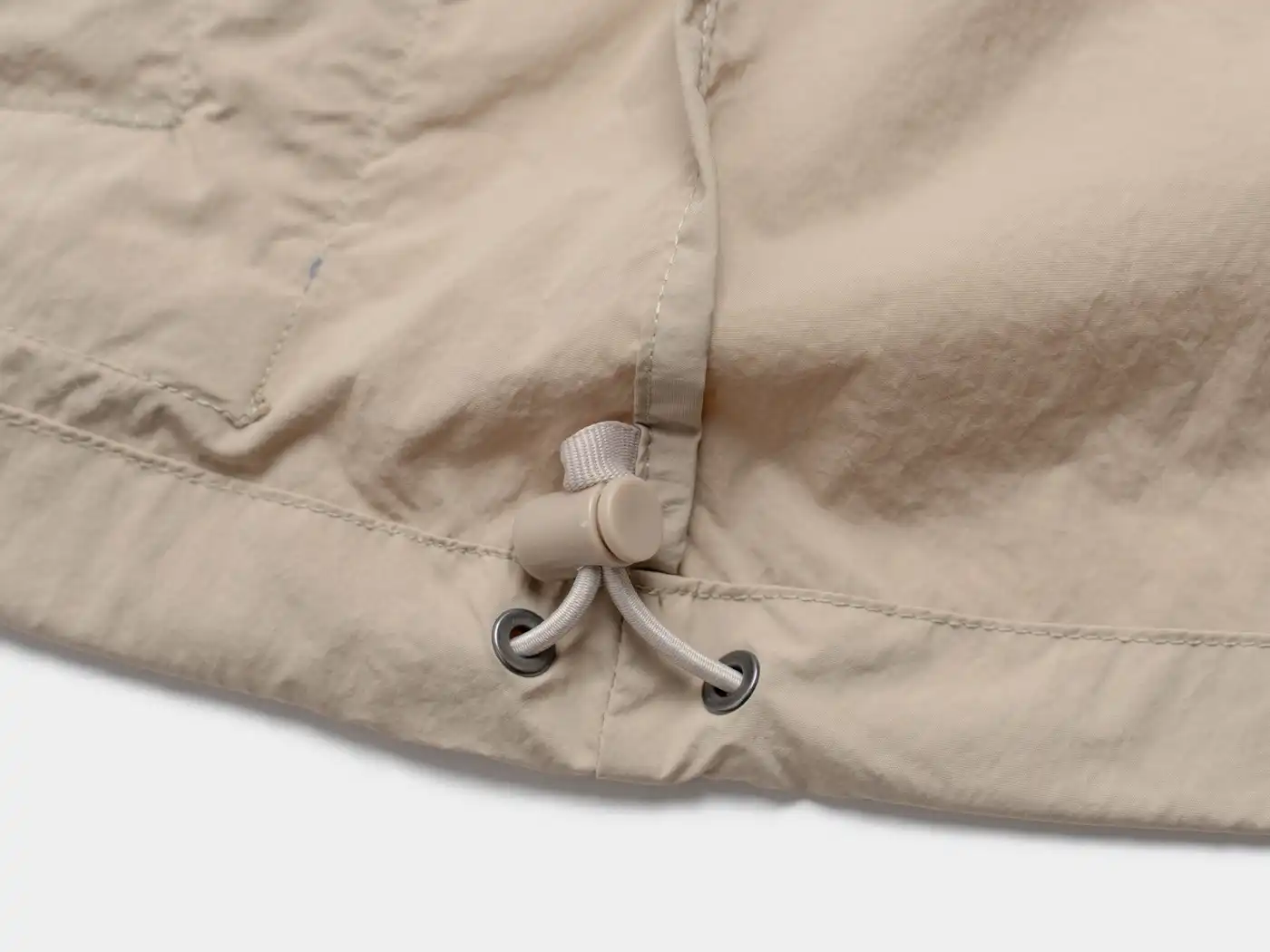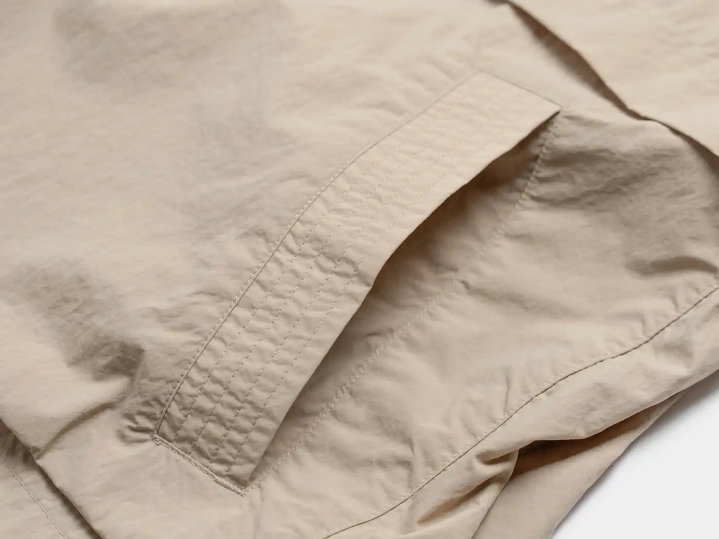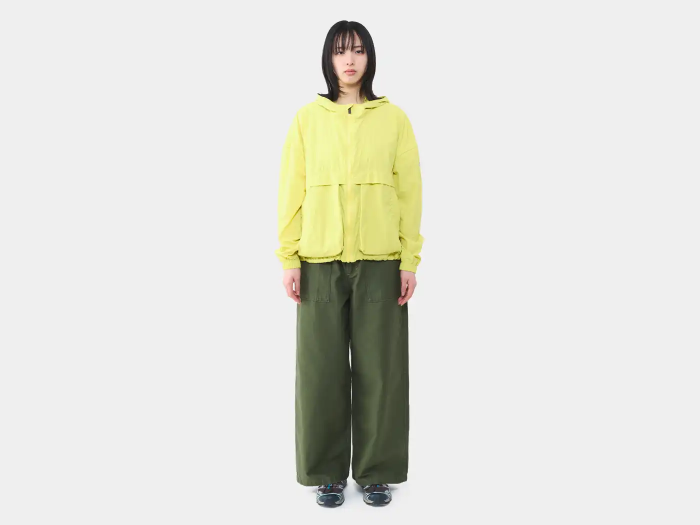 オーバーサイズで肩のラインをおとしたデザインや、ポイントとなるフロントの立体的なポケットのデザインなどスポーティになり過ぎず、快適な気心地の1着です。ナチュラルなシワ加工を施した表情豊かなナイロン素材は、撥水・防風機能を持ち、カラビナ付きのストレージバッグが付きどこにでも携帯できる手軽さが魅力です。